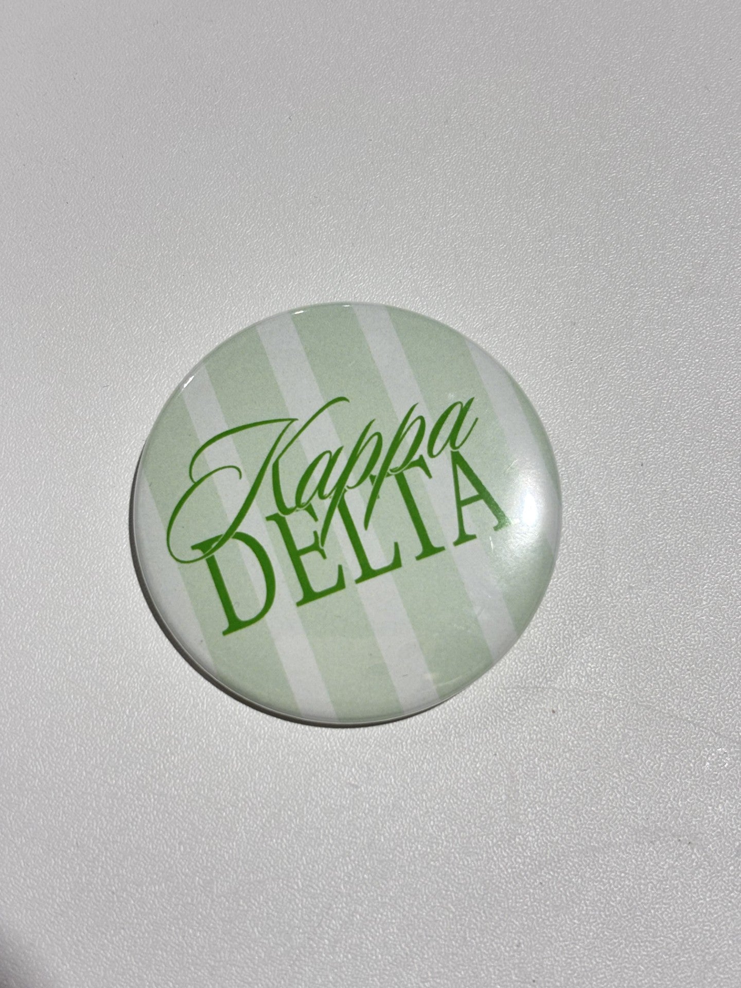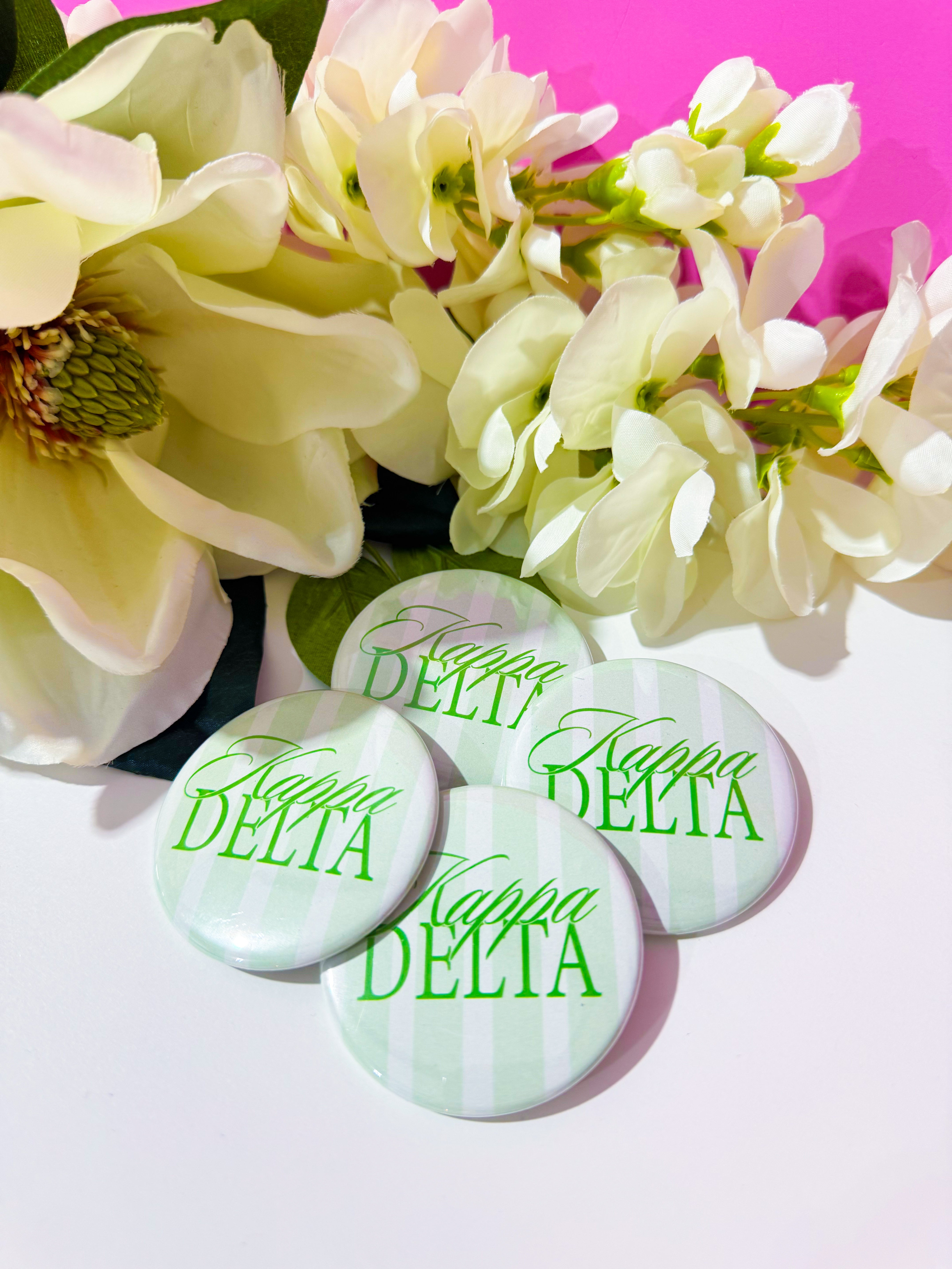 Show your Kappa Delta spirit with our classic green and white stripe pin-back button! This button measures 2 1/4''.