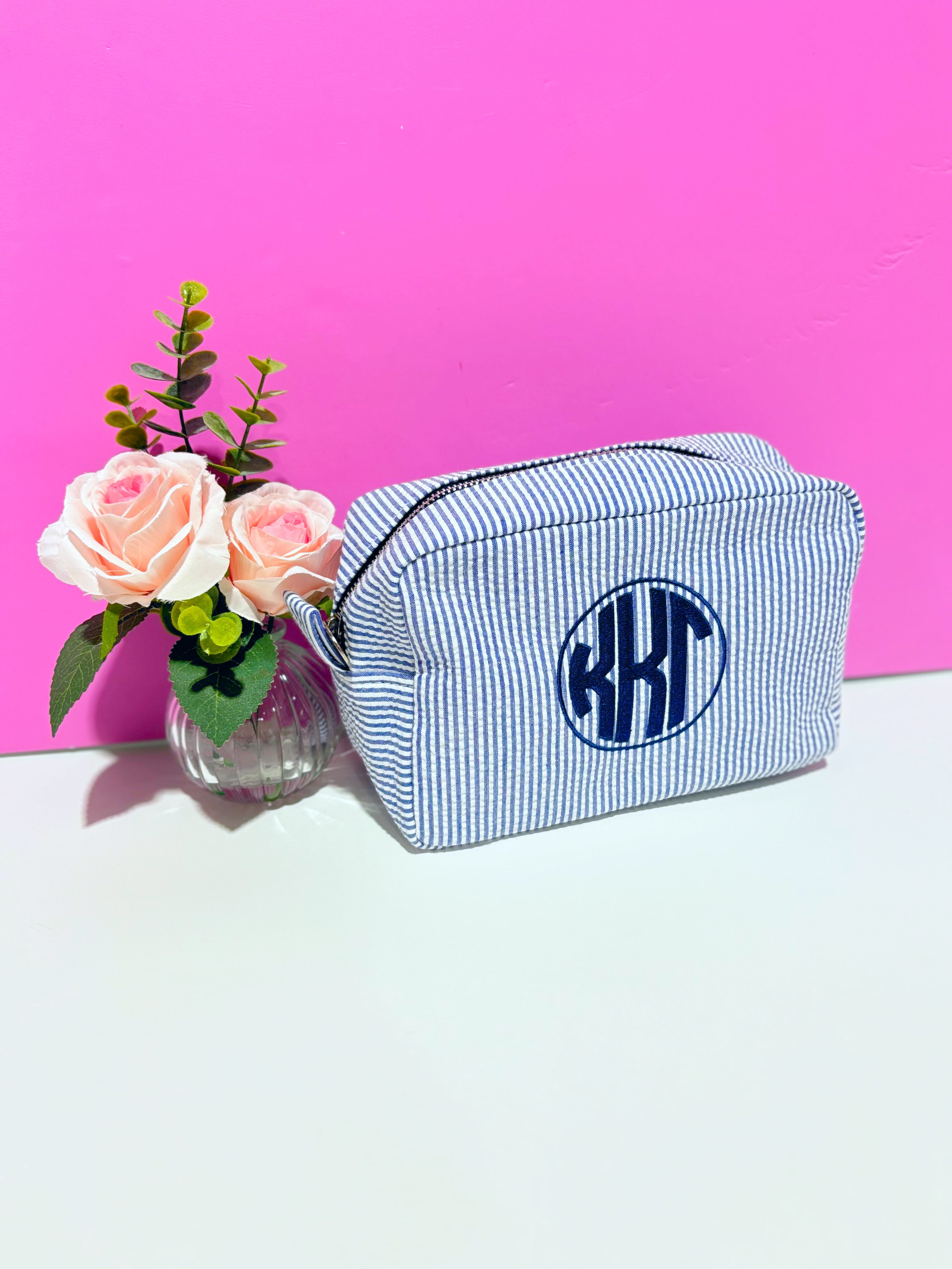 Our Kappa Kappa Gamma Seersucker Cosmetic Bag is beautifully embroidered with a southern circle monogram !
