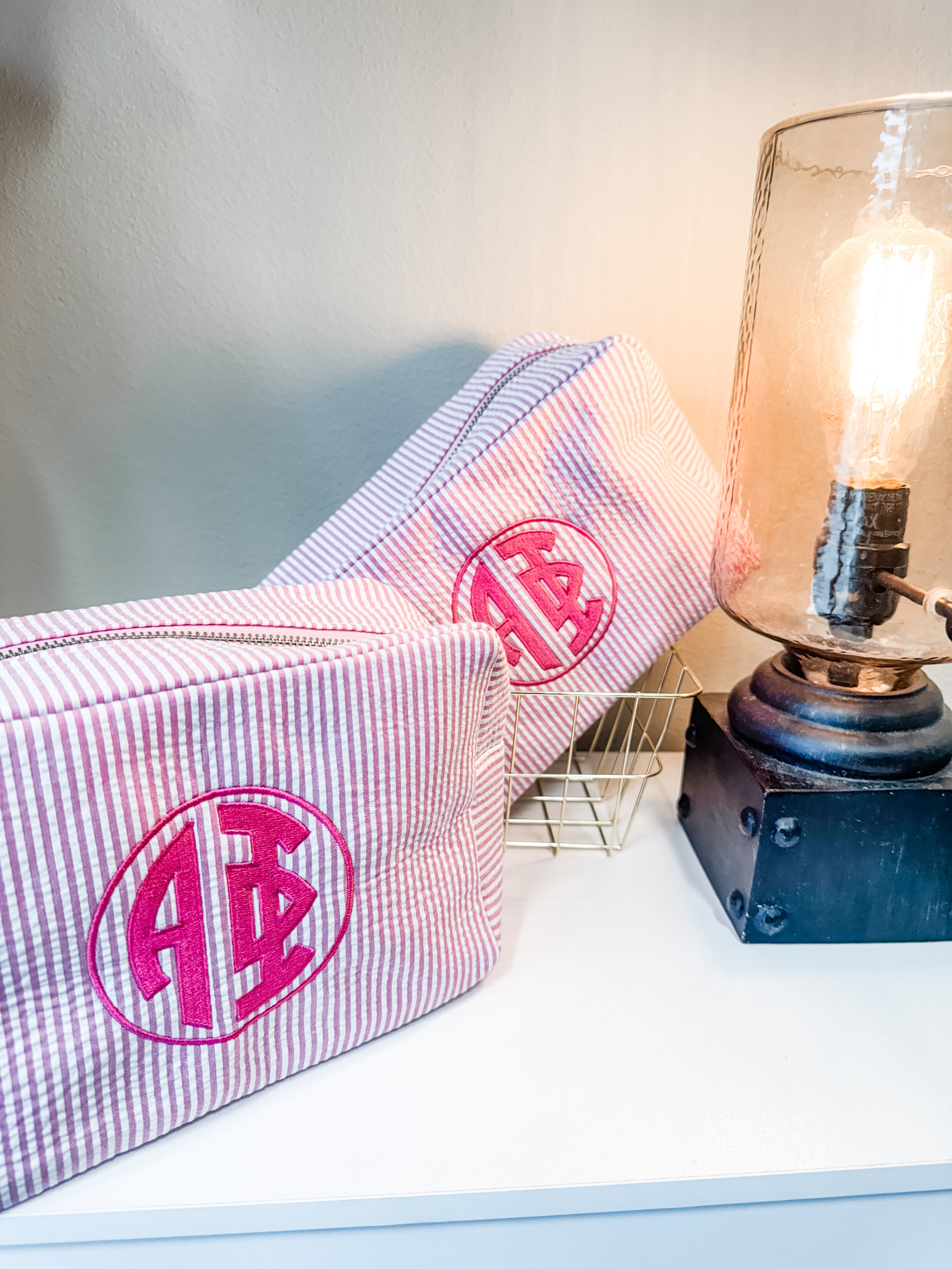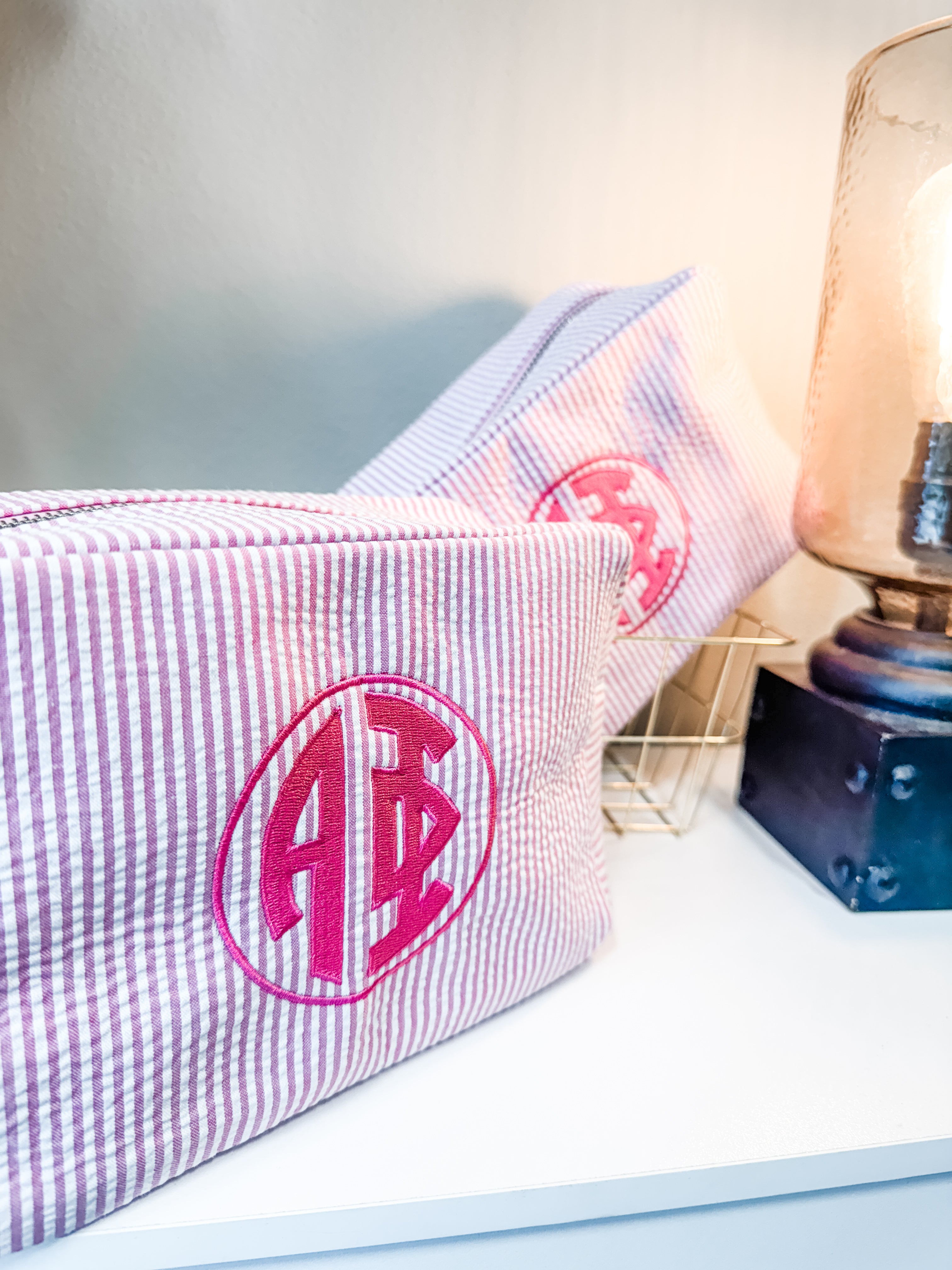 Our Alpha Phi Seersucker Cosmetic Bag is beautifully embroidered with a southern circle monogram !