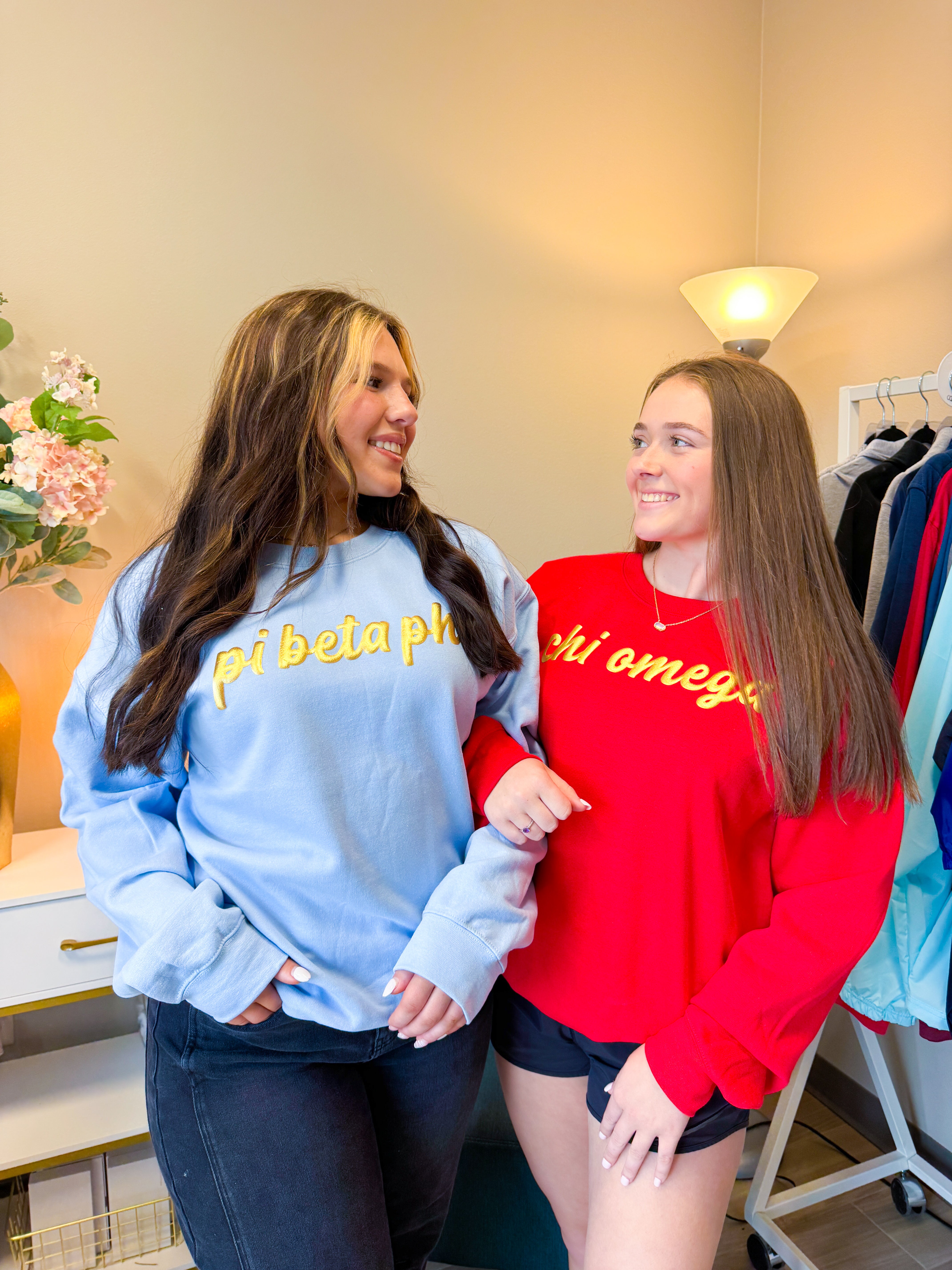 Take your favorite puff print and make it GOLD METALLIC! Yes, Rush has it and you will love it! Custom designed and created by Rush Greek Gifts, this crewneck sweatshirt will be a campus show stopper!