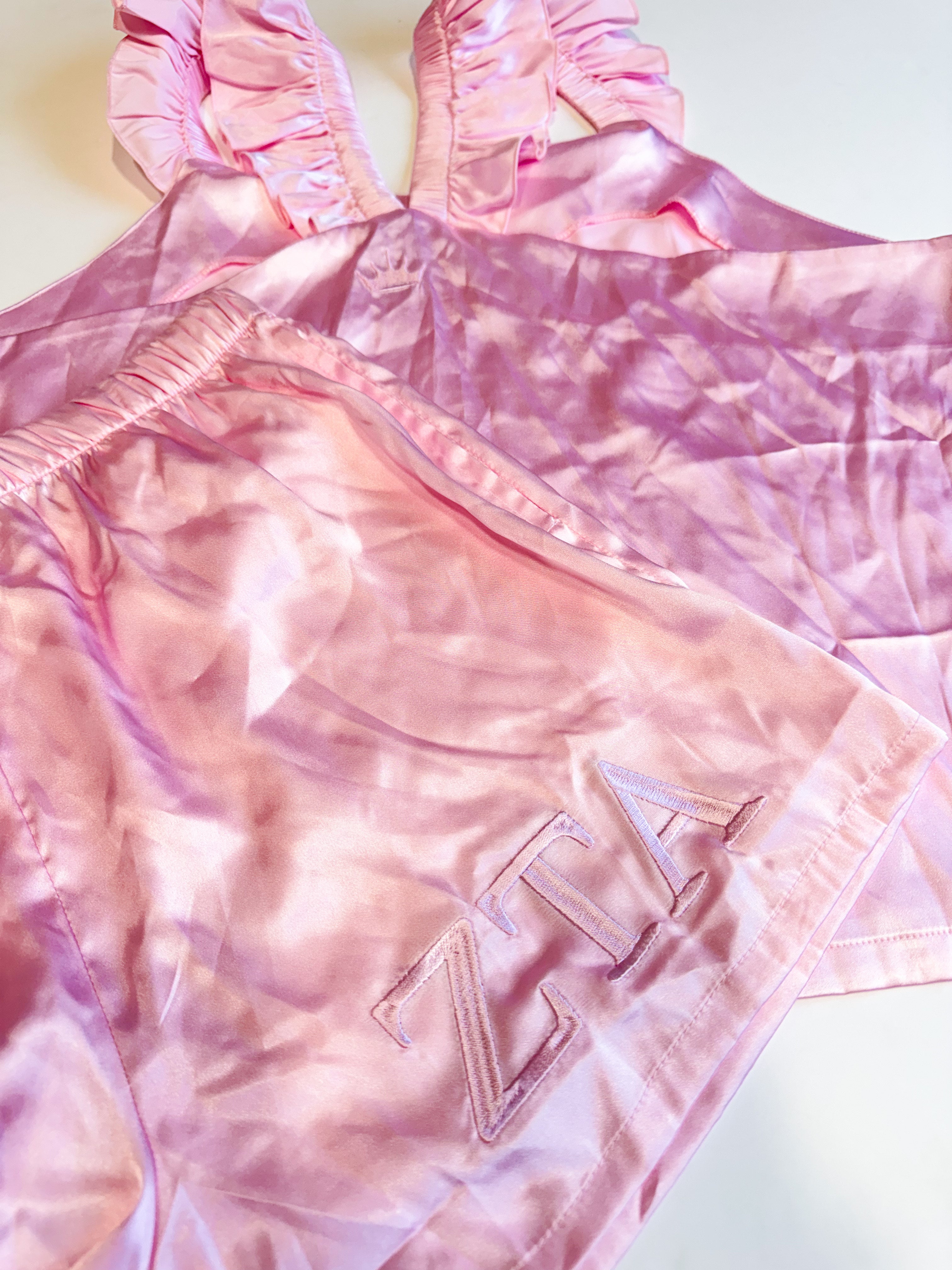 Shop the sweetest satin pajama set for every cozy night in! This set perfect for sleepovers, bid day baskets, big–little gifts, or matching with your chapter. Cute, comfy, and girly, it’s the go-to look for making every night feel like Bid Day!