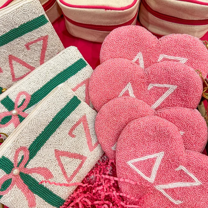 This custom heart-shaped beaded coin purse is a must-have gift for any sorority member! Officially licensed and a new release for spring 2025!