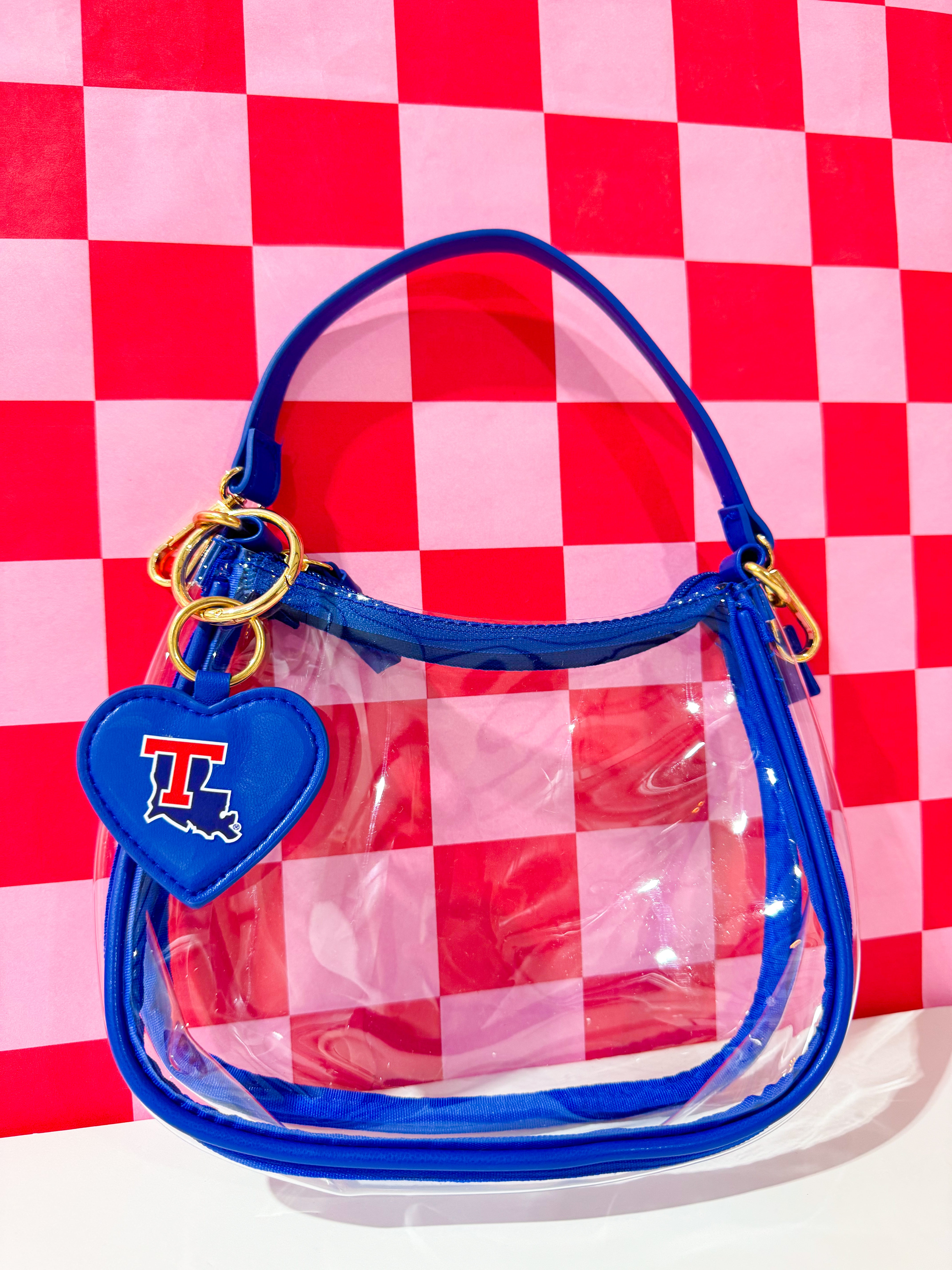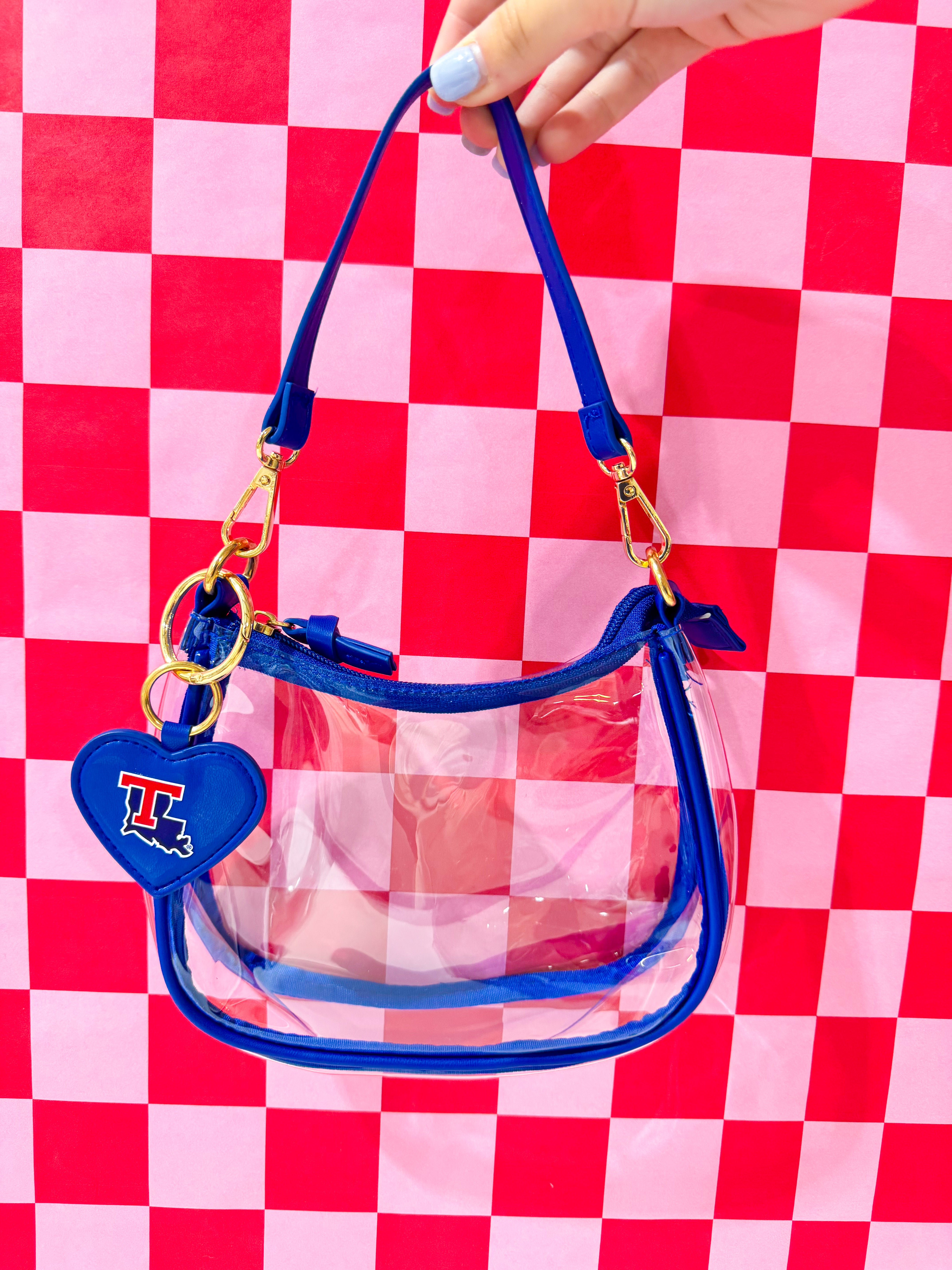 Carry our Louisiana Tech Clear Purse—a stylish, stadium-approved accessory designed for game days, concerts, and beyond. Includes an exclusive Louisiana Tech heart-shaped charm, adding a unique touch! Comes with two strap options—an over-the-shoulder strap for everyday outings and an adjustable crossbody strap for hands-free convenience