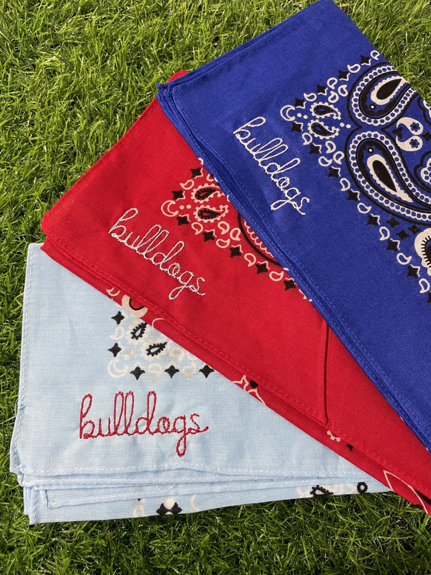 Stay cool and fashionable with our Bulldog Script Bandana! Available in light blue, true blue, and red!