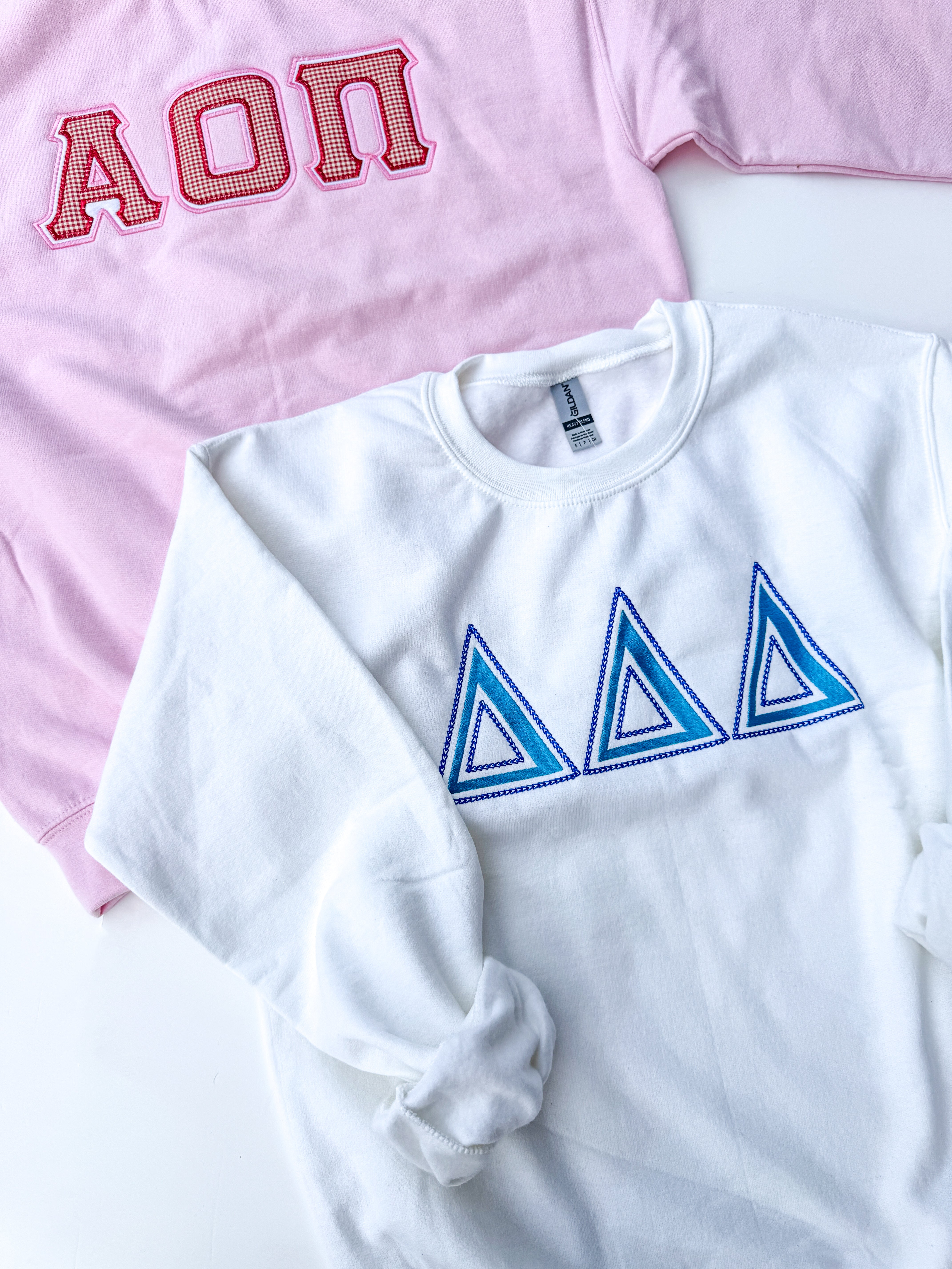 The newest approach to "stitched letter" sweatshirts! Our chain stitch makes the sweetest pullover to wear to class. Embroidered on a basic Gildan crewneck & fits true to size.