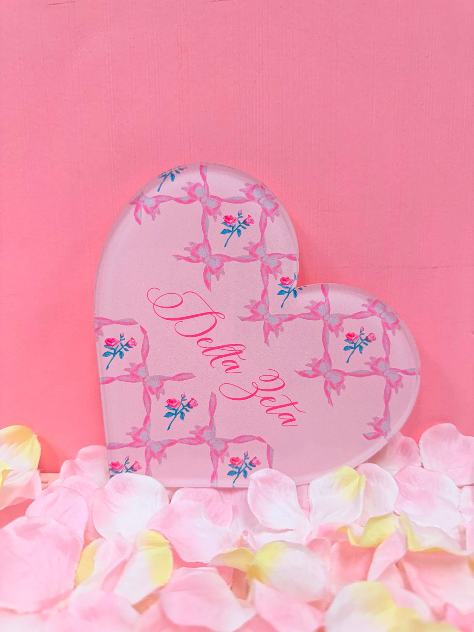 It's the perfect nightstand or coffee table accessory! The heart shaped coaster features a feminine floral print with the sorority name in a script font on one side and the sorority nickname on the other side! Being made of thick acrylic makes it functional and cute!