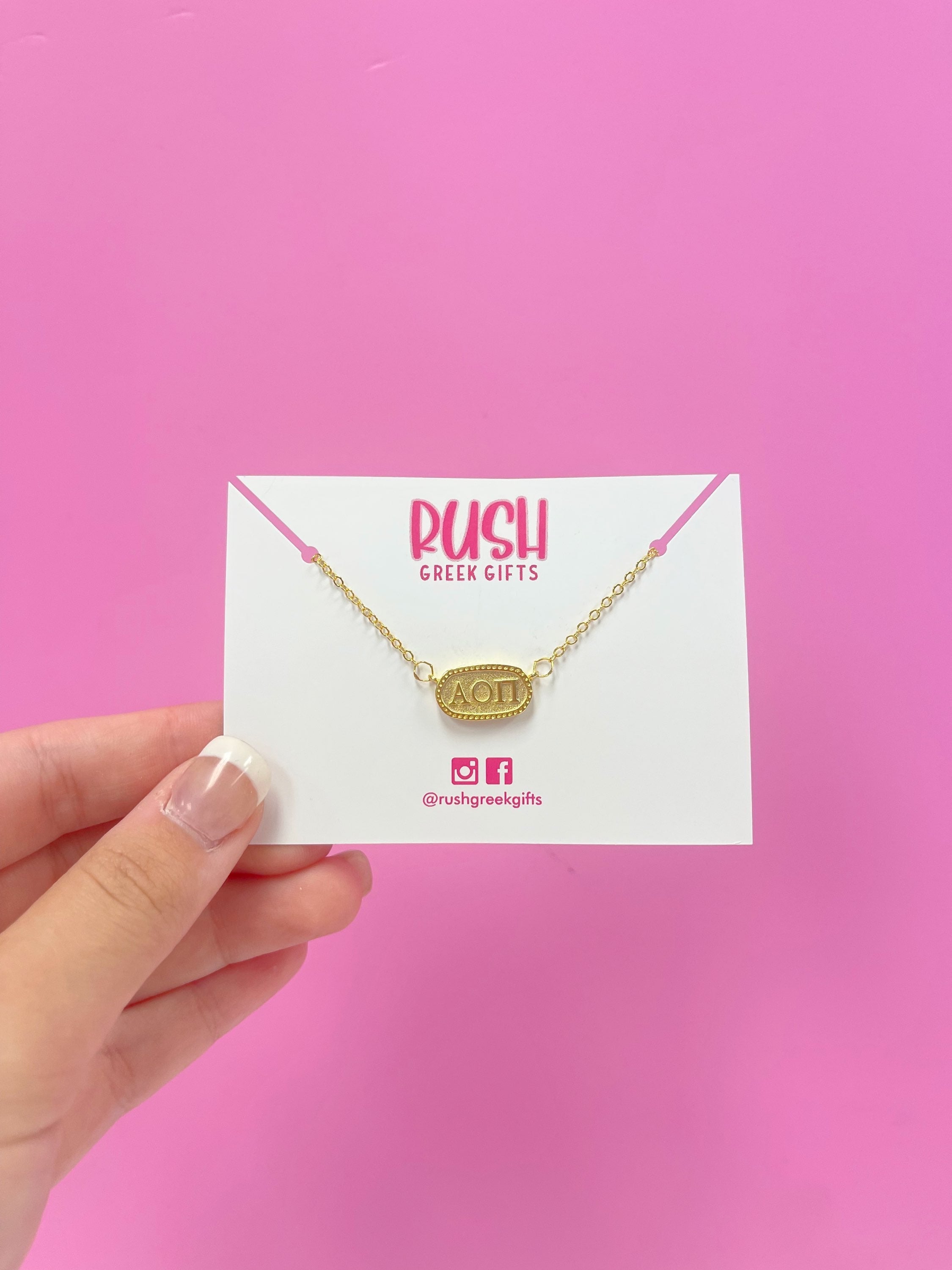 Alpha Omicron Pi Gold Oval Pendant Necklace