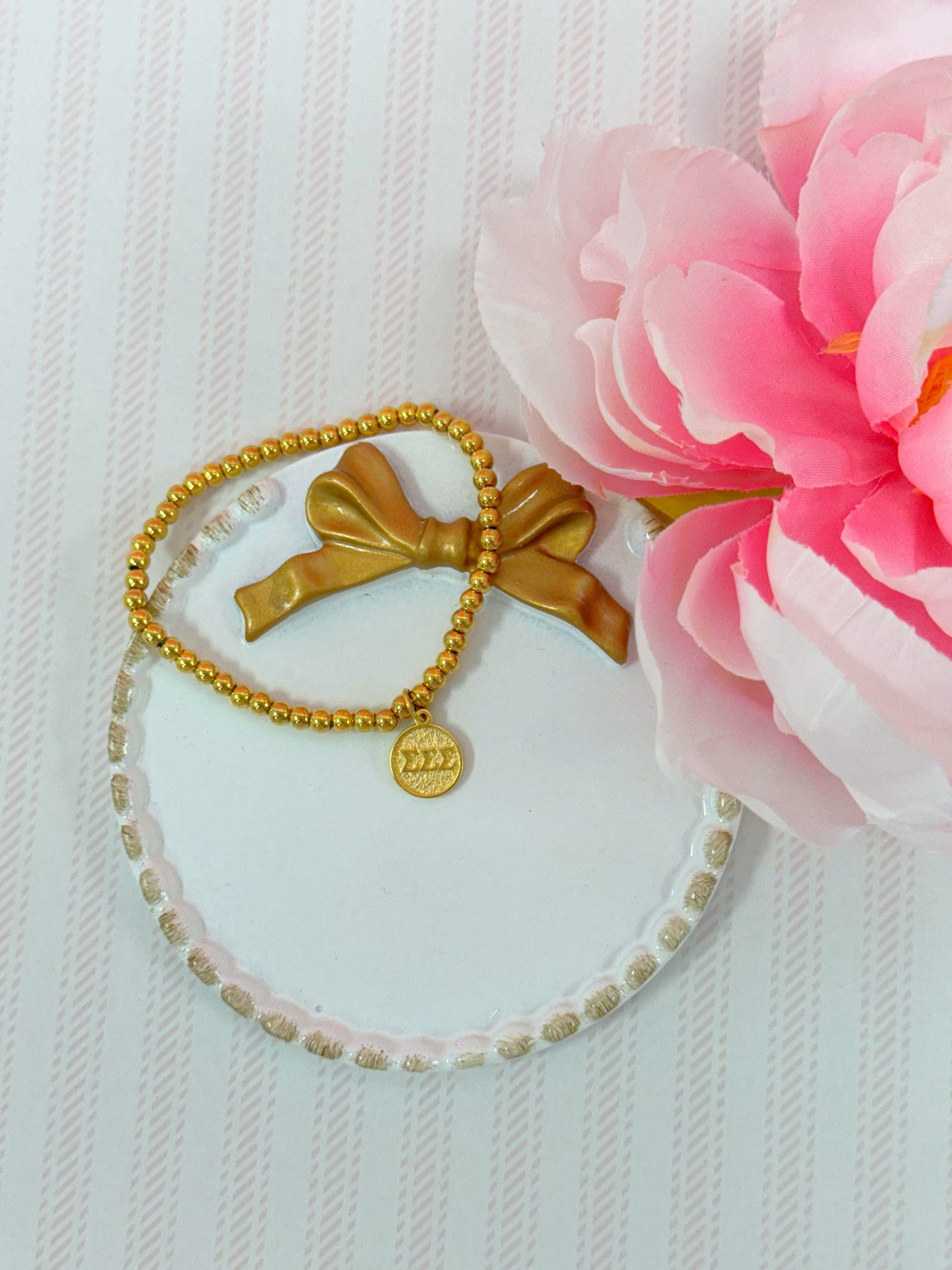 Our Sorority Gold Bead Bracelet is perfect to mix with your favorite stack or even to wear on its own! It's a stretch 4MM gold bead bracelet with Greek letter circle dangle charm.