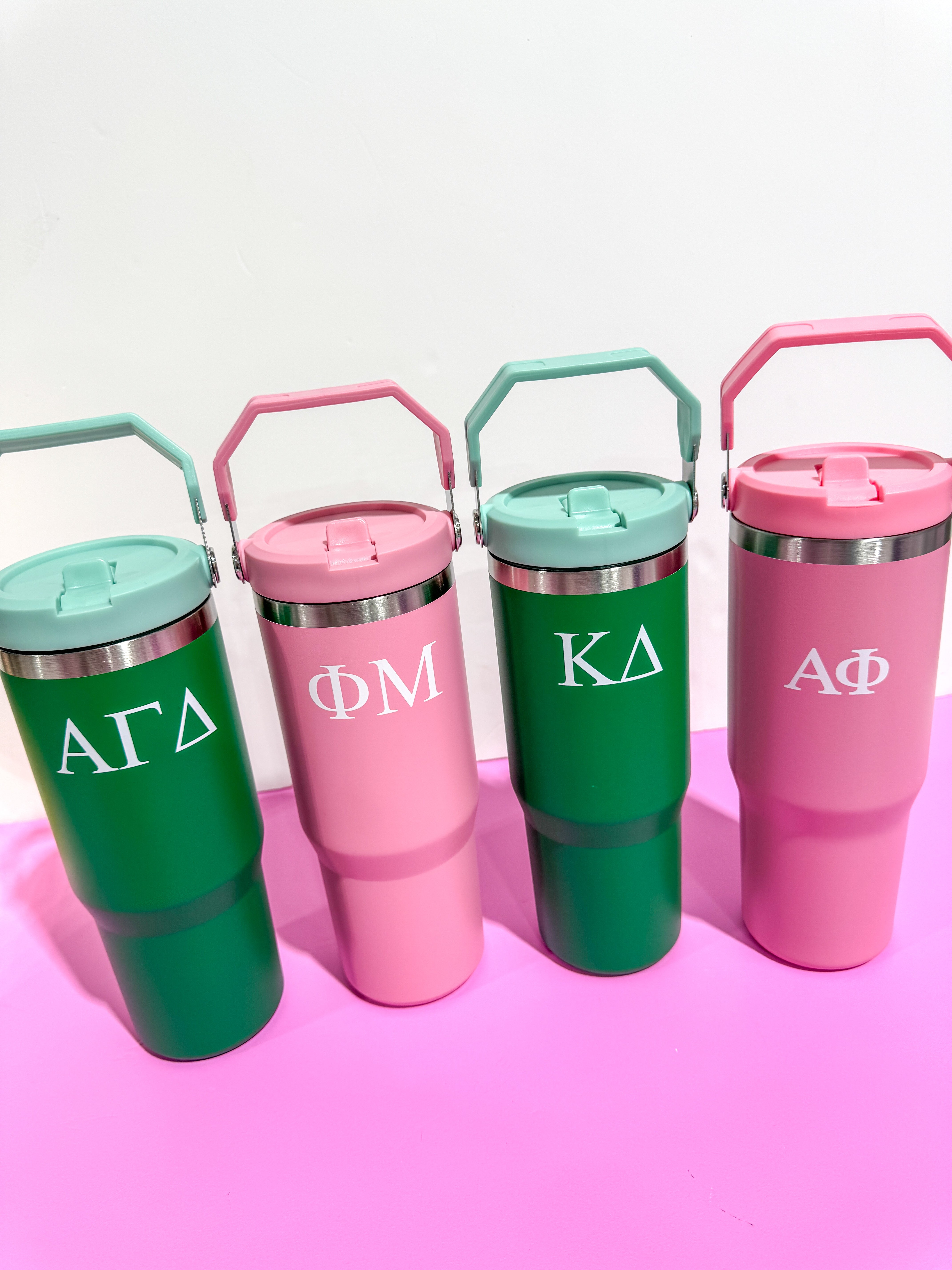 Our Rush exclusive 30 oz. Flip Straw Tumbler is great for those backpack side pockets and is so cute with your sorority letters printed on the front!