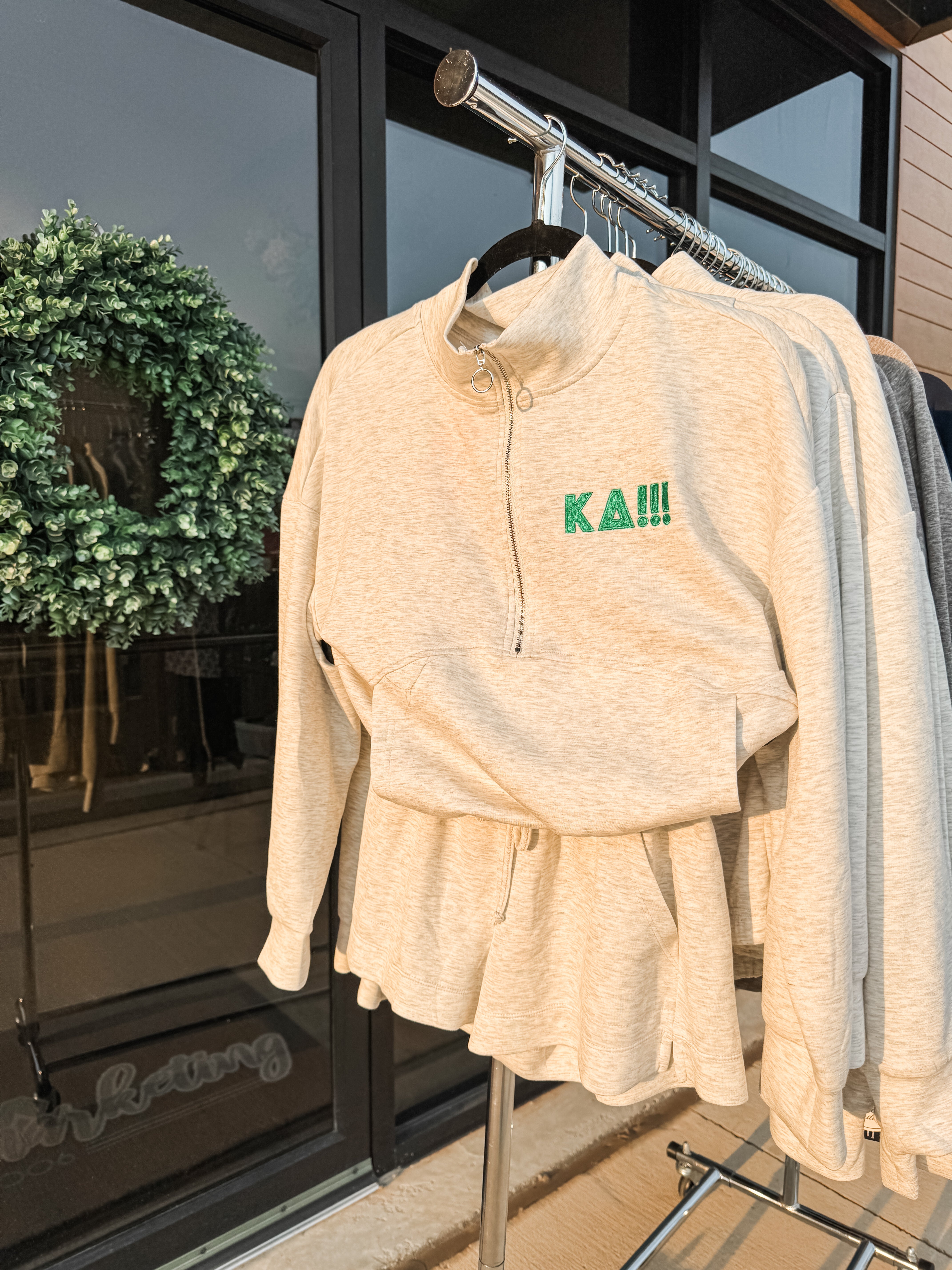 This set is to die for! The material is luxe, soft, lightweight, and perfect for going to class or coffee with your sisters. The top is a quarter zip with KD!!! embroidery. The shorts are drawstring and fit true to size.