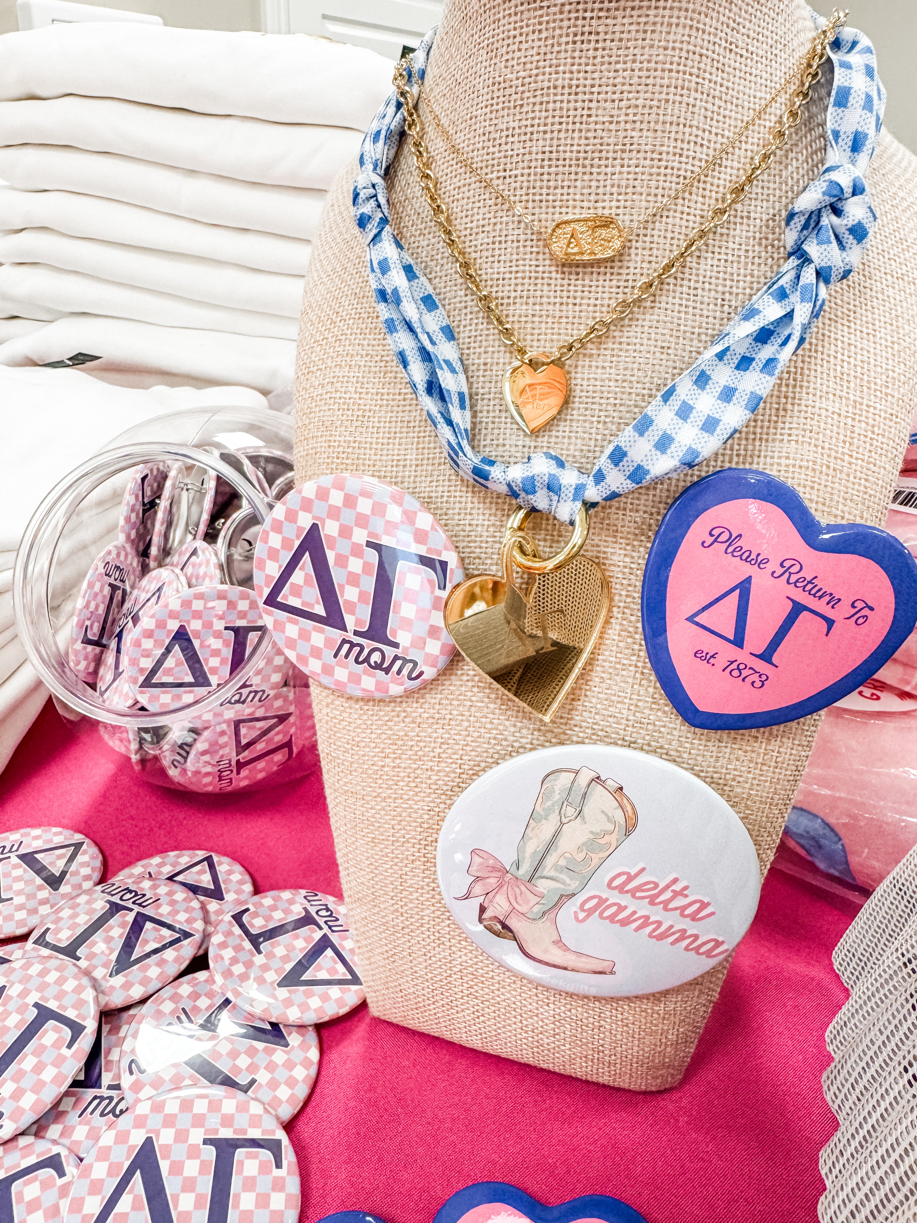 Laser cut mirrored acrylic pendant with engraved Greek letters. Includes an O-ring lever clasp to attach to a necklace, scarf, chain, twilly, or bag.