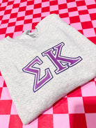 The newest approach to "stitched letter" sweatshirts! Our chain stitch makes the sweetest pullover to wear to class. Embroidered on a basic Gildan crewneck & fits true to size.