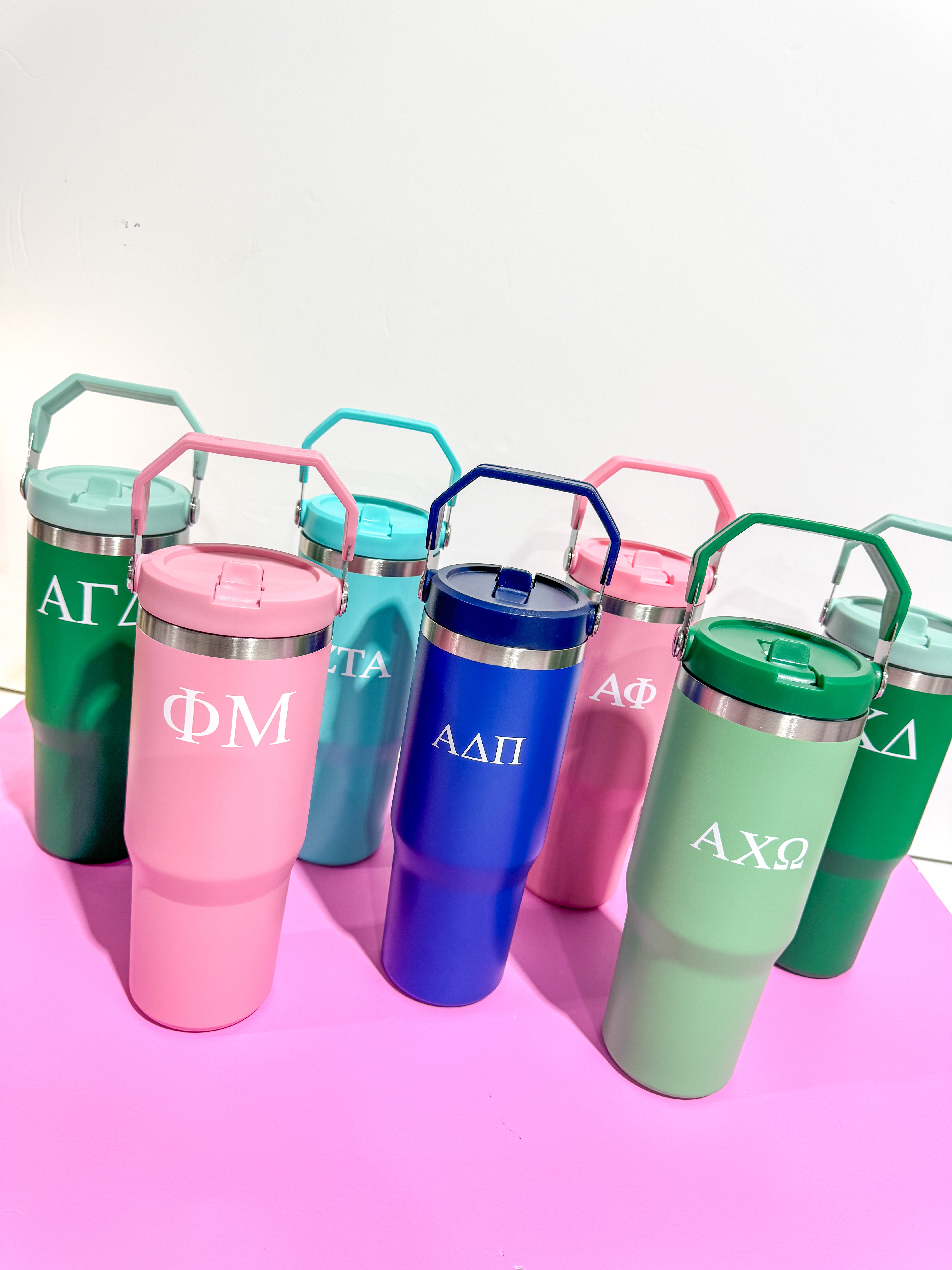 Our Rush exclusive 30 oz Flip Straw Tumbler is great for those backpack side pockets and is so cute with your sorority letters printed on the front!