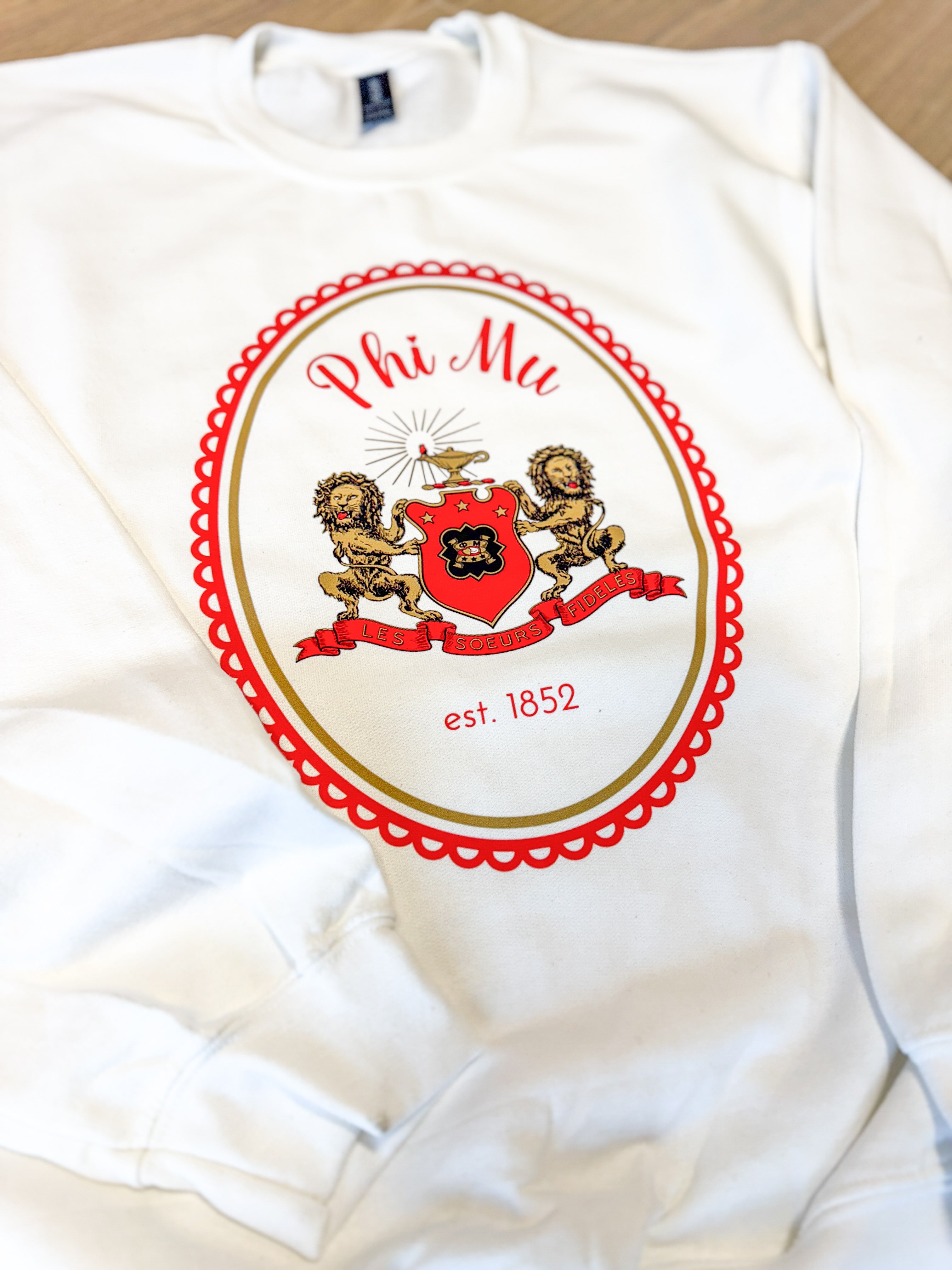 A new take on the classic crest. We have taken the traditional Phi Mu crest and added the scallop trend. Sweatshirt fits true to size.