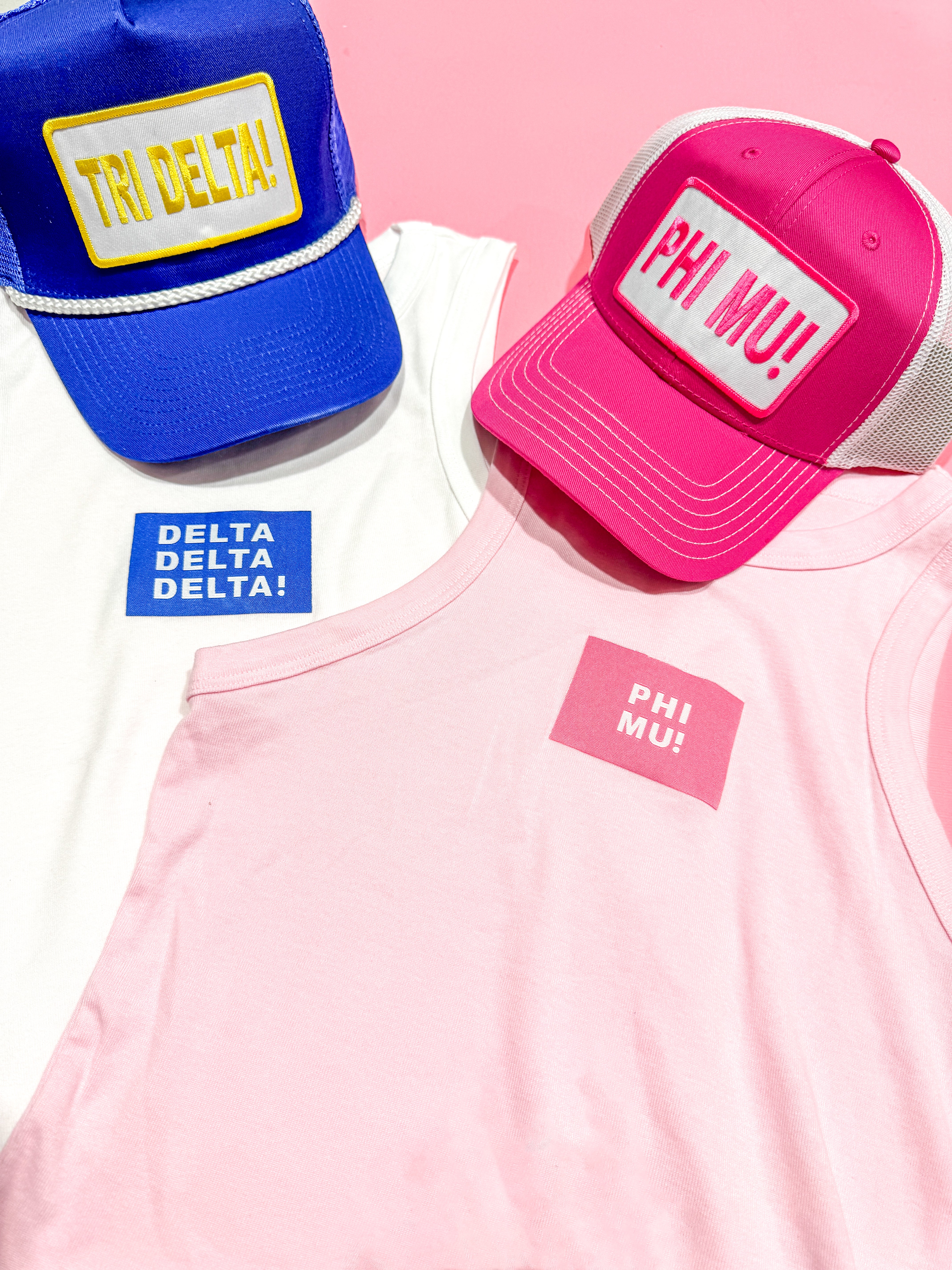 It's your favorite color -- PINK! This patch hat makes the best addition to your outfit for bid day, a theme party, or going to class!