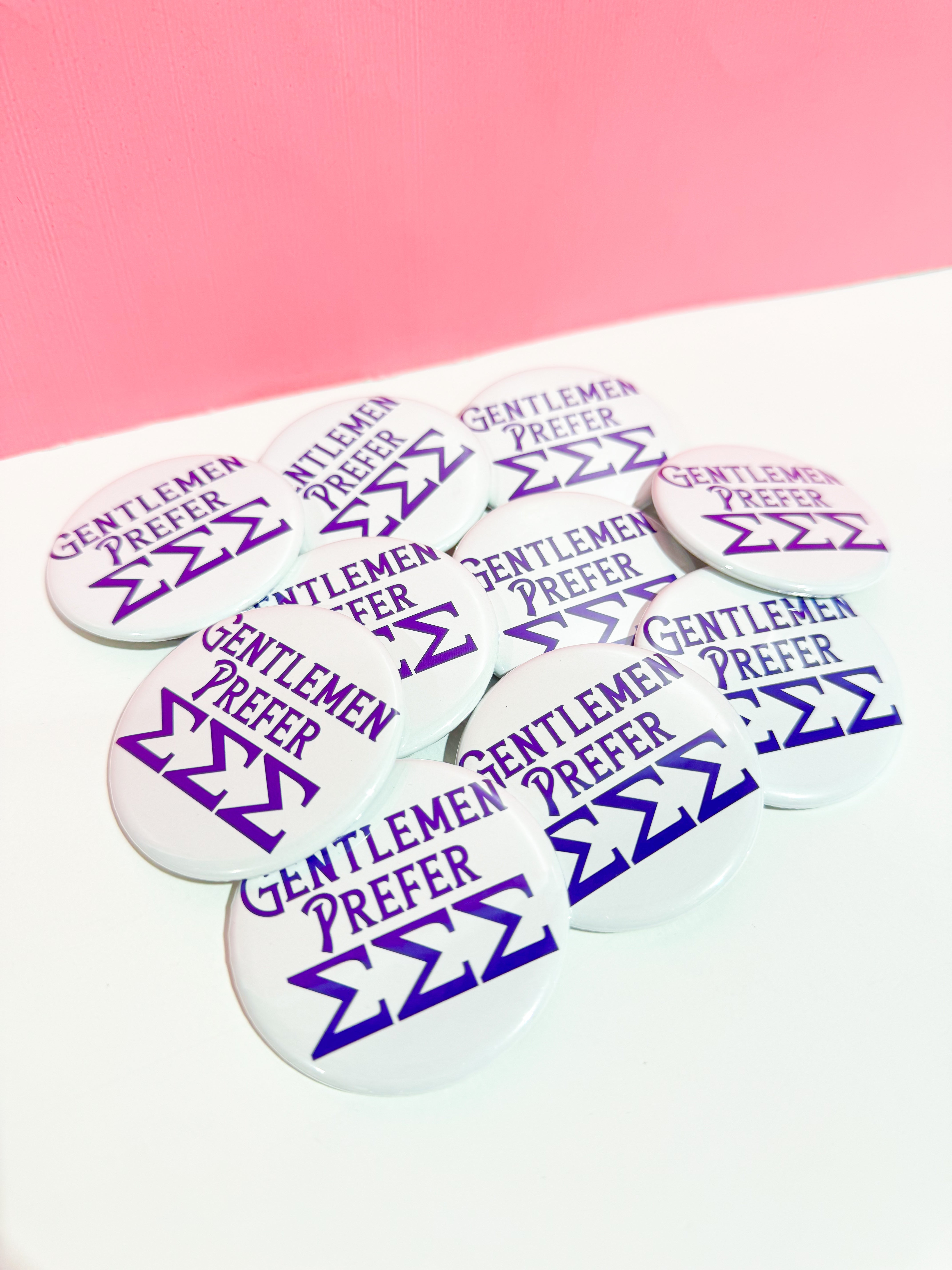 Looking for a button for the special guy in your life? Our Gentlemen Prefer button is the perfect addition to your boyfriend, dad, or guy friend's outfit. Simple, bold, and easy to wear—it's a great way to rep your favorite sorority!