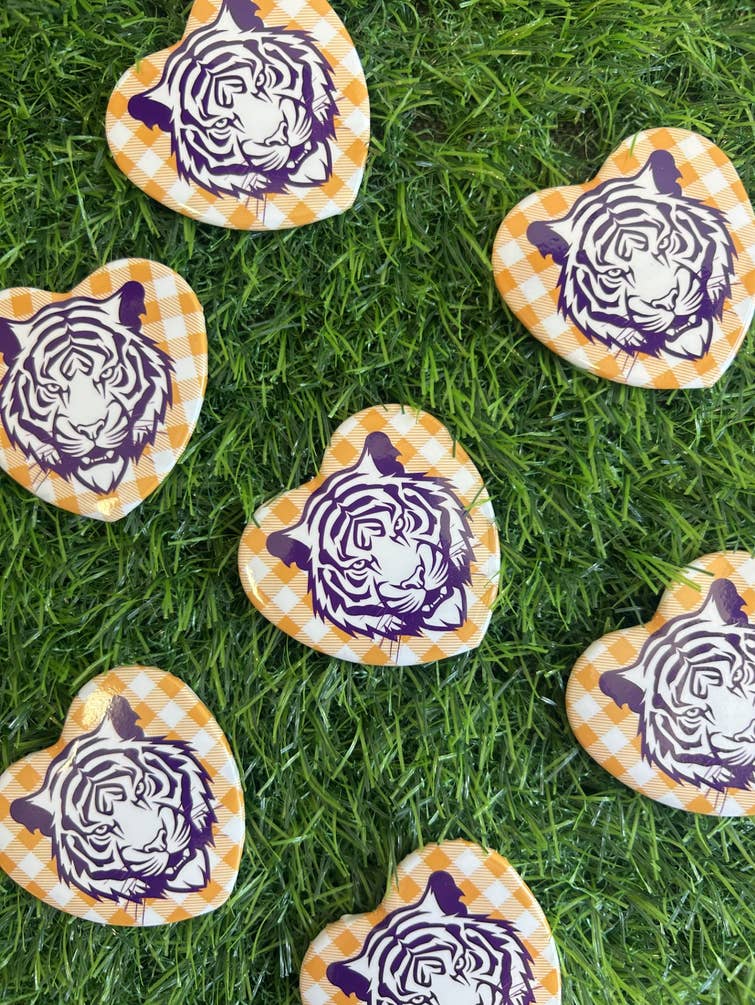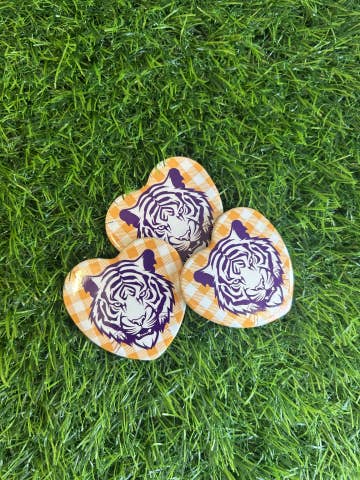 Get your gameday outfits ready with our Checkered Heart Tiger Button! This button is the perfect accessory to add to your collection, so shop now while supplies last!