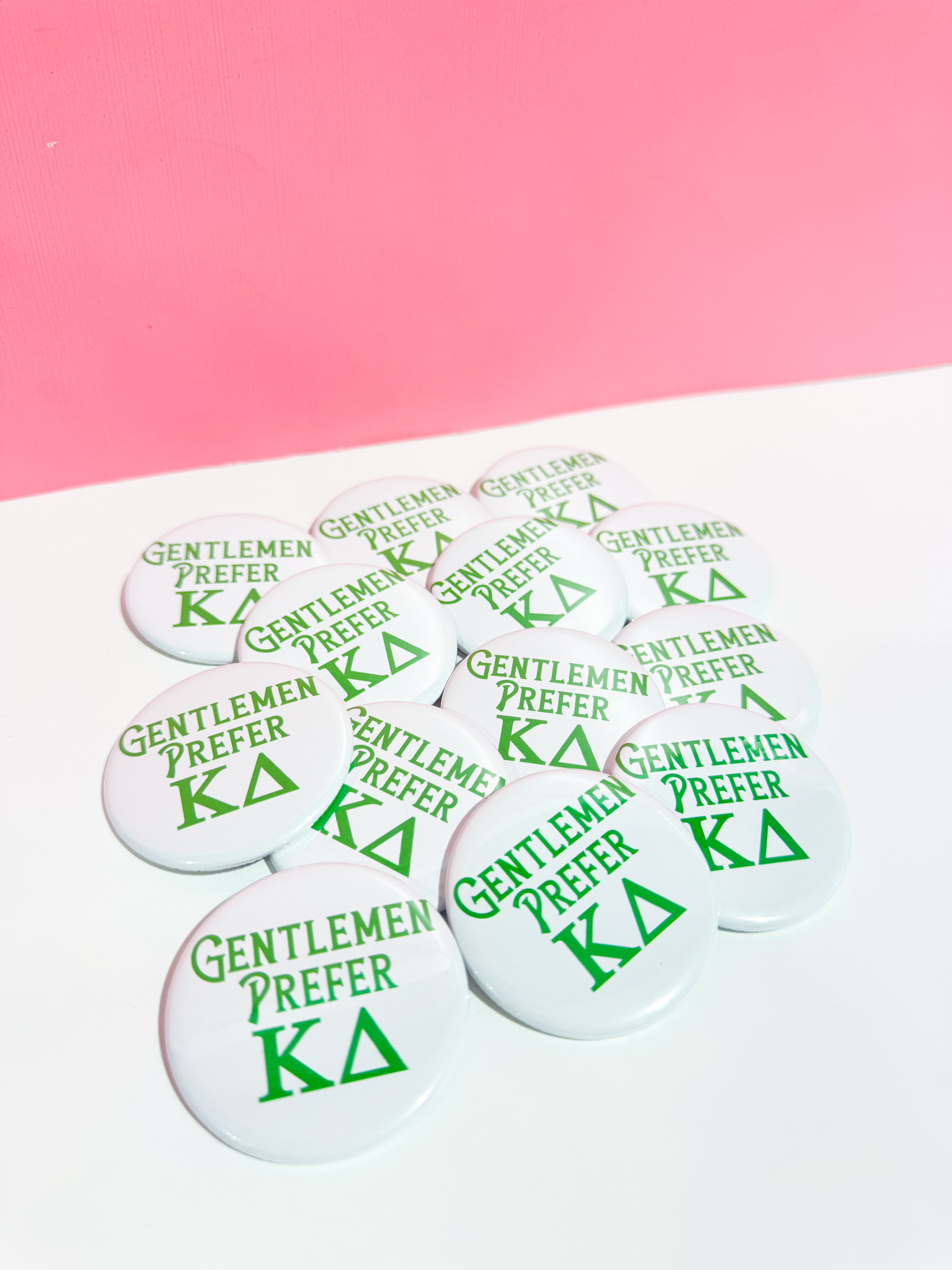Looking for a button for the special guy in your life? Our Gentlemen Prefer button is the perfect addition to your boyfriend, dad, or guy friend's outfit. Simple, bold, and easy to wear—it's a great way to rep your favorite sorority!