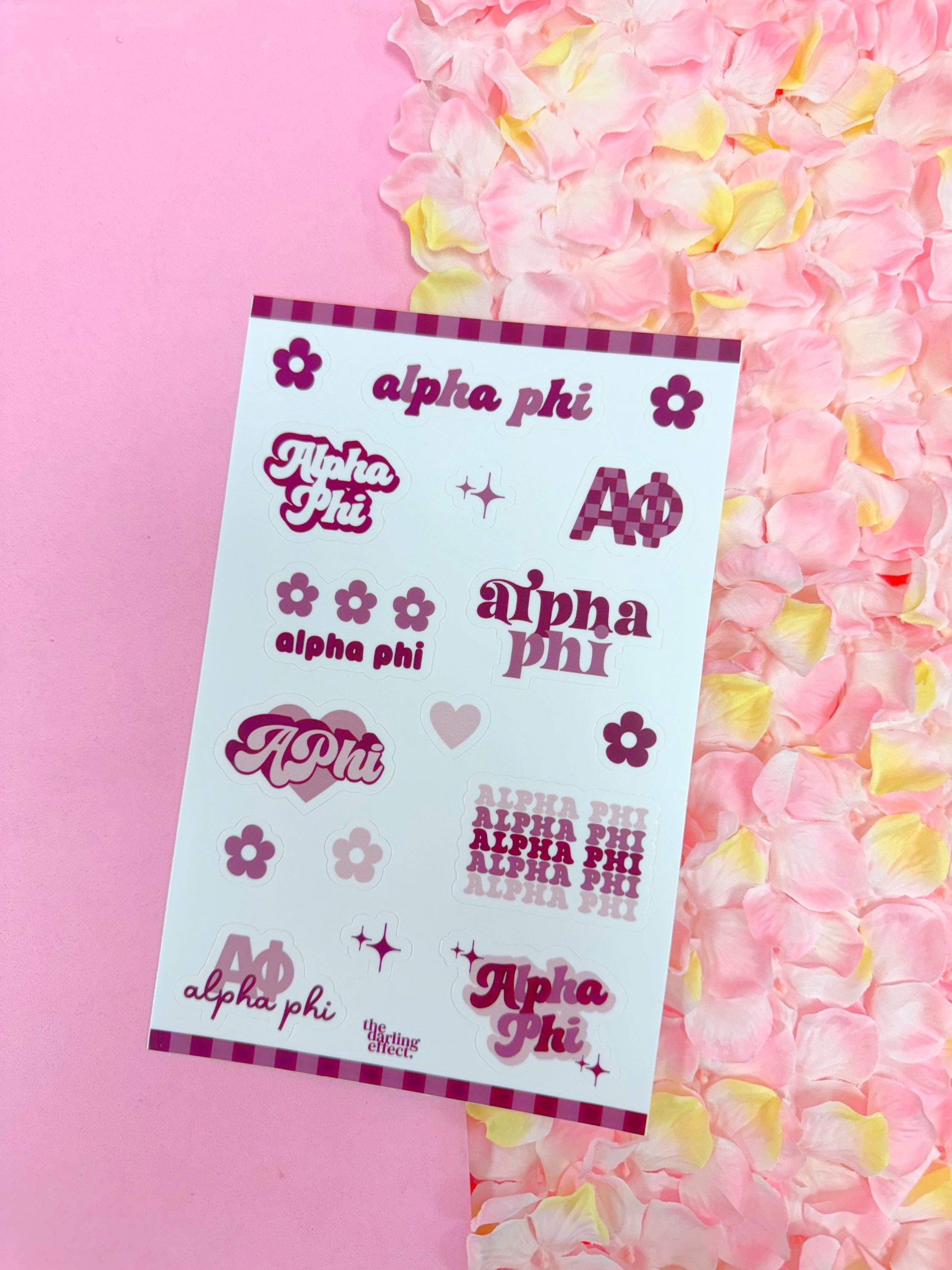 Show your sorority love with these cute sorority stickers! They are the perfect accessory for your laptop, water bottle and notebook! The sheet measures 8.5x5.5" with 9 sorority specific stickers and a total of 14 stickers per sheet!