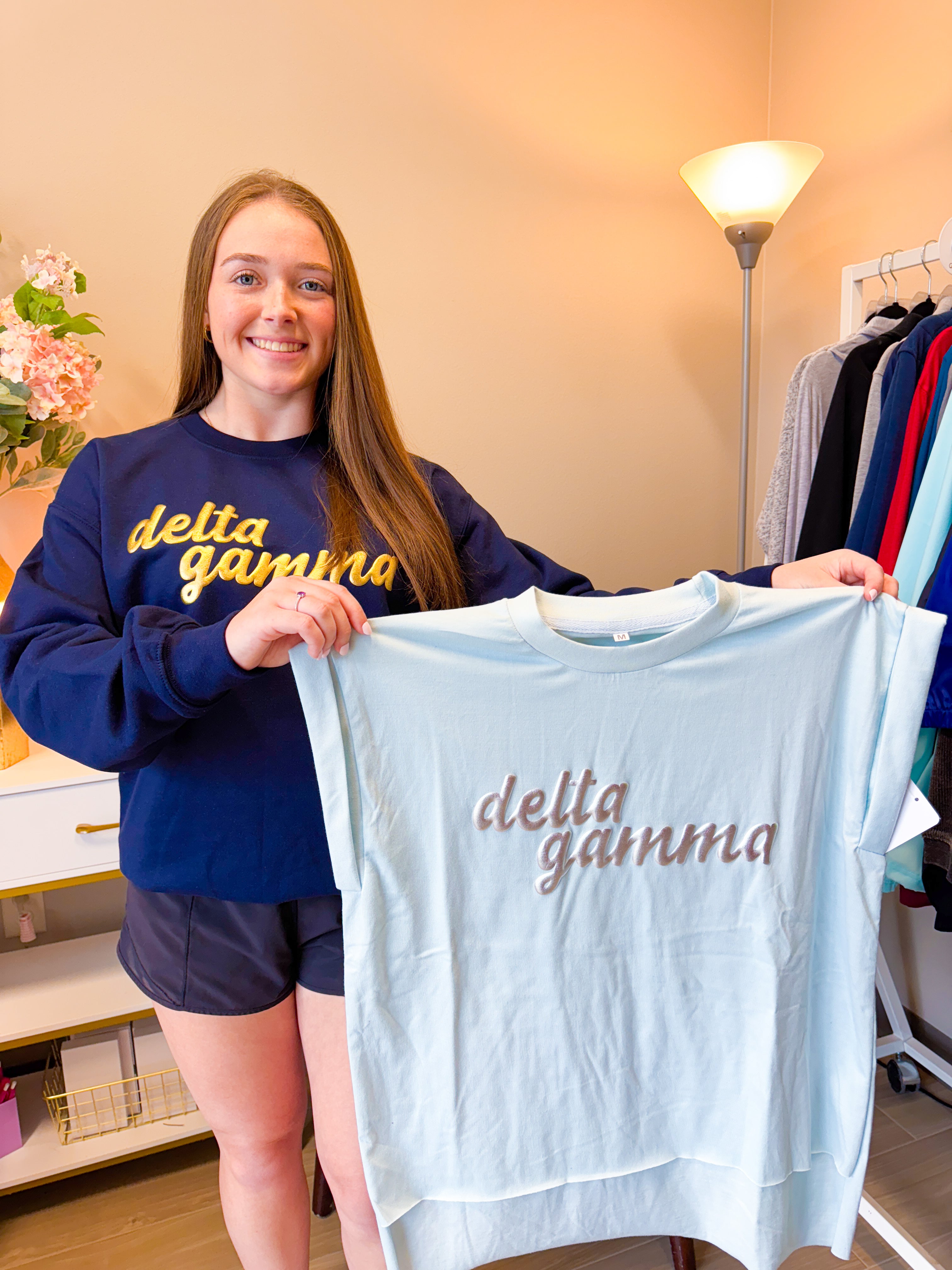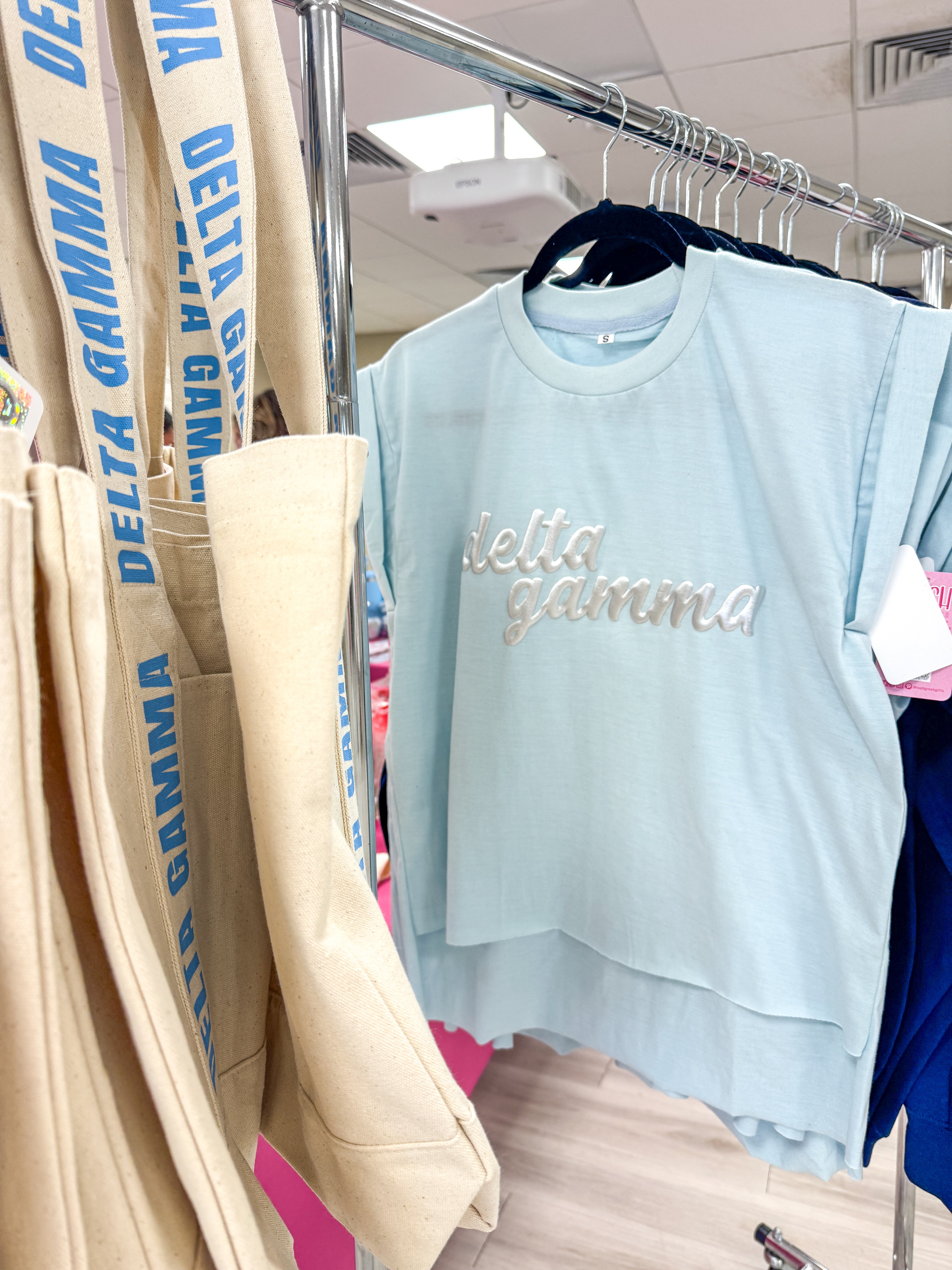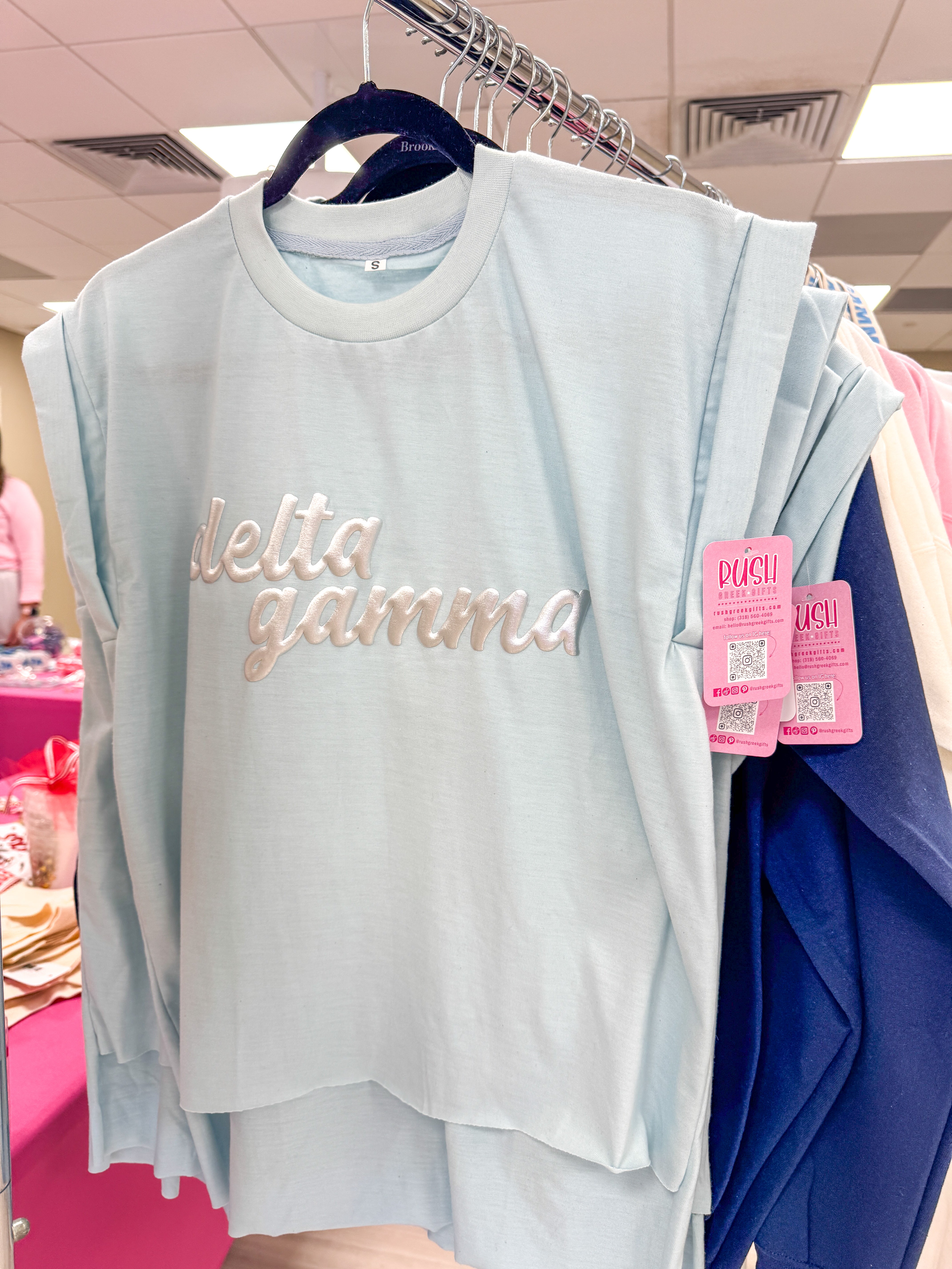 The most fun trend has joined the sorority world! Silver metallic puff print on light blue cap sleeve and Delta Gamma combined!