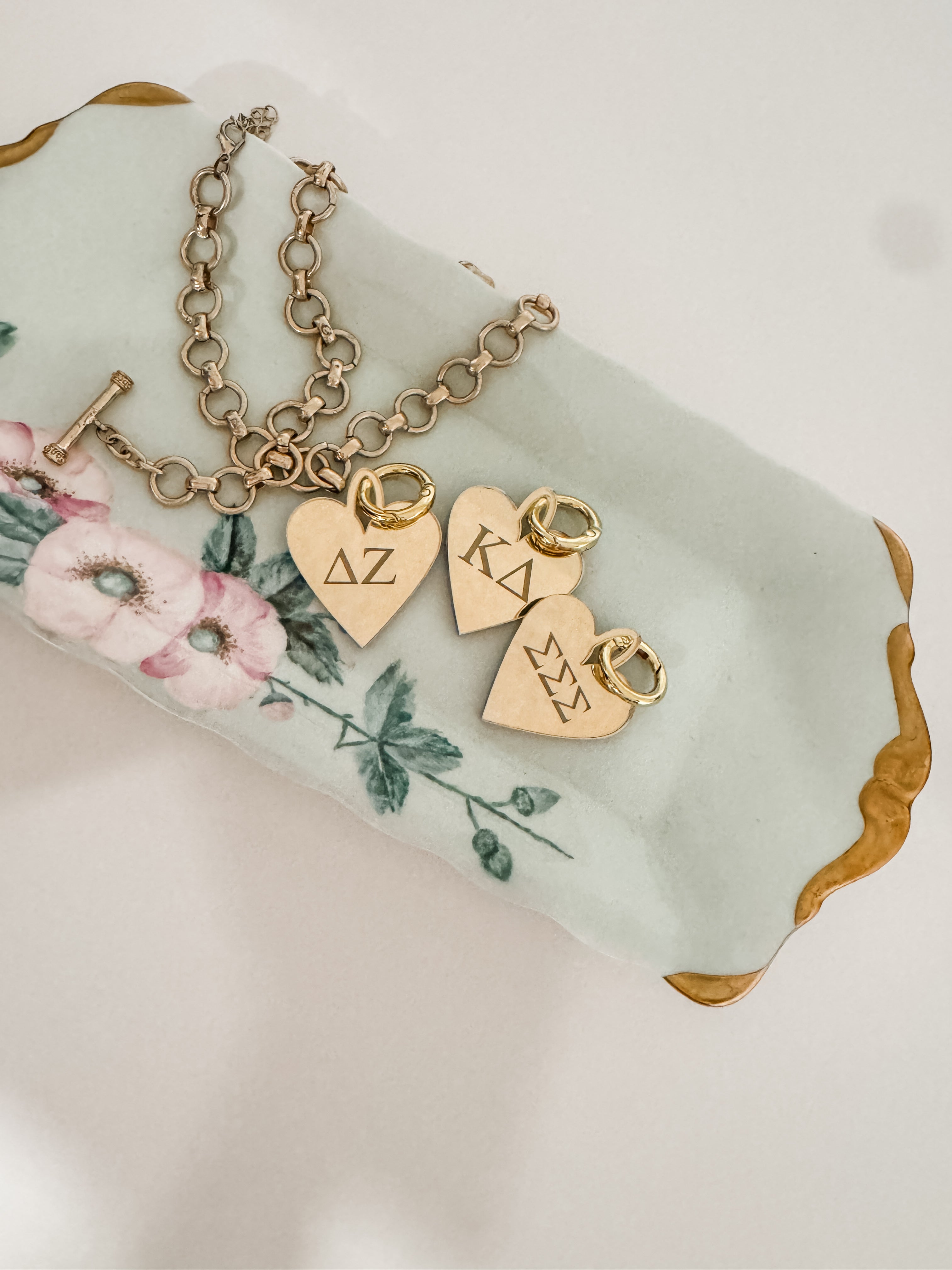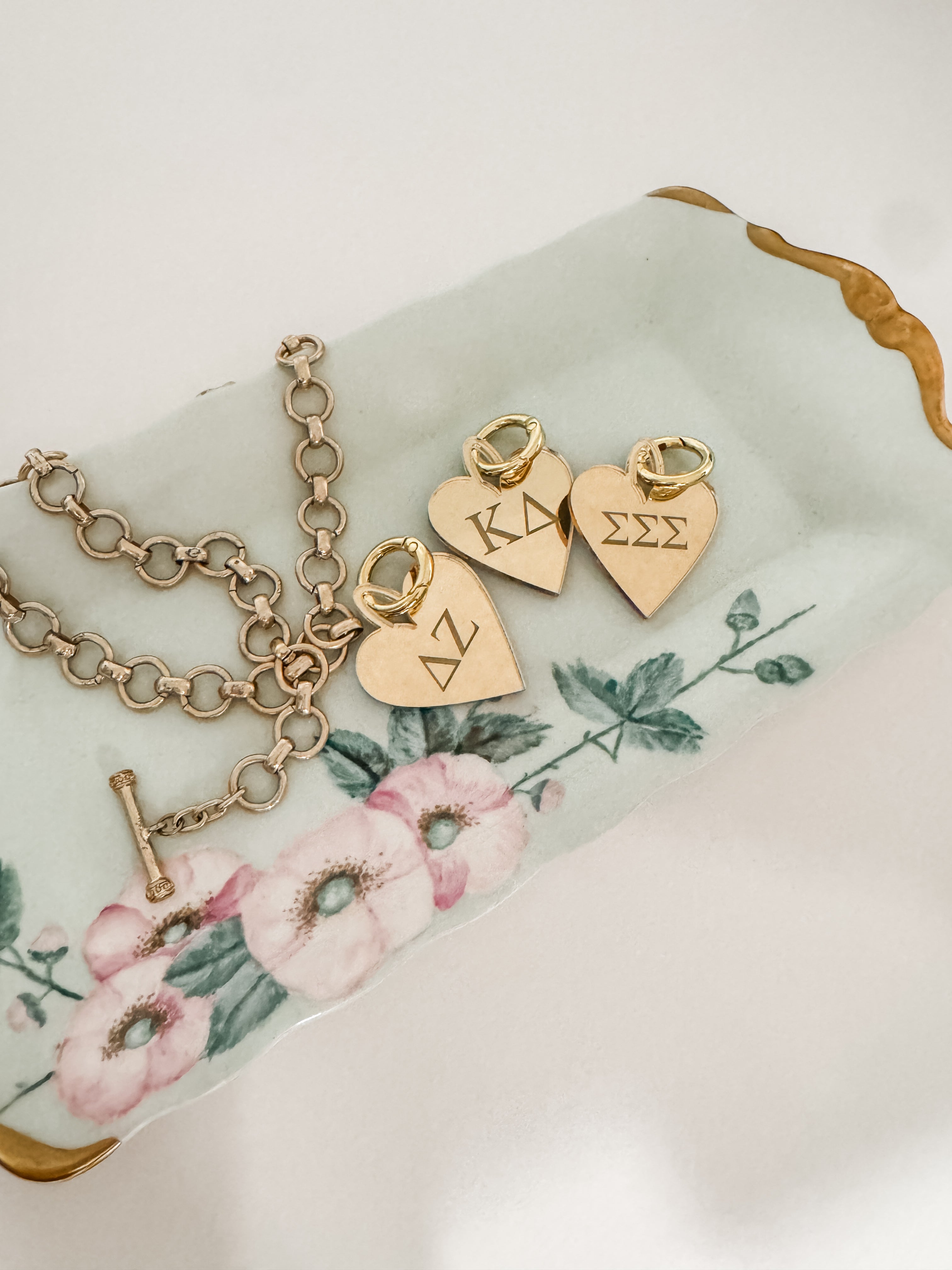 Laser cut mirrored acrylic pendant with engraved Greek letters. Includes an O-ring lever clasp to attach to a necklace, scarf, chain, twilly, or bag.
