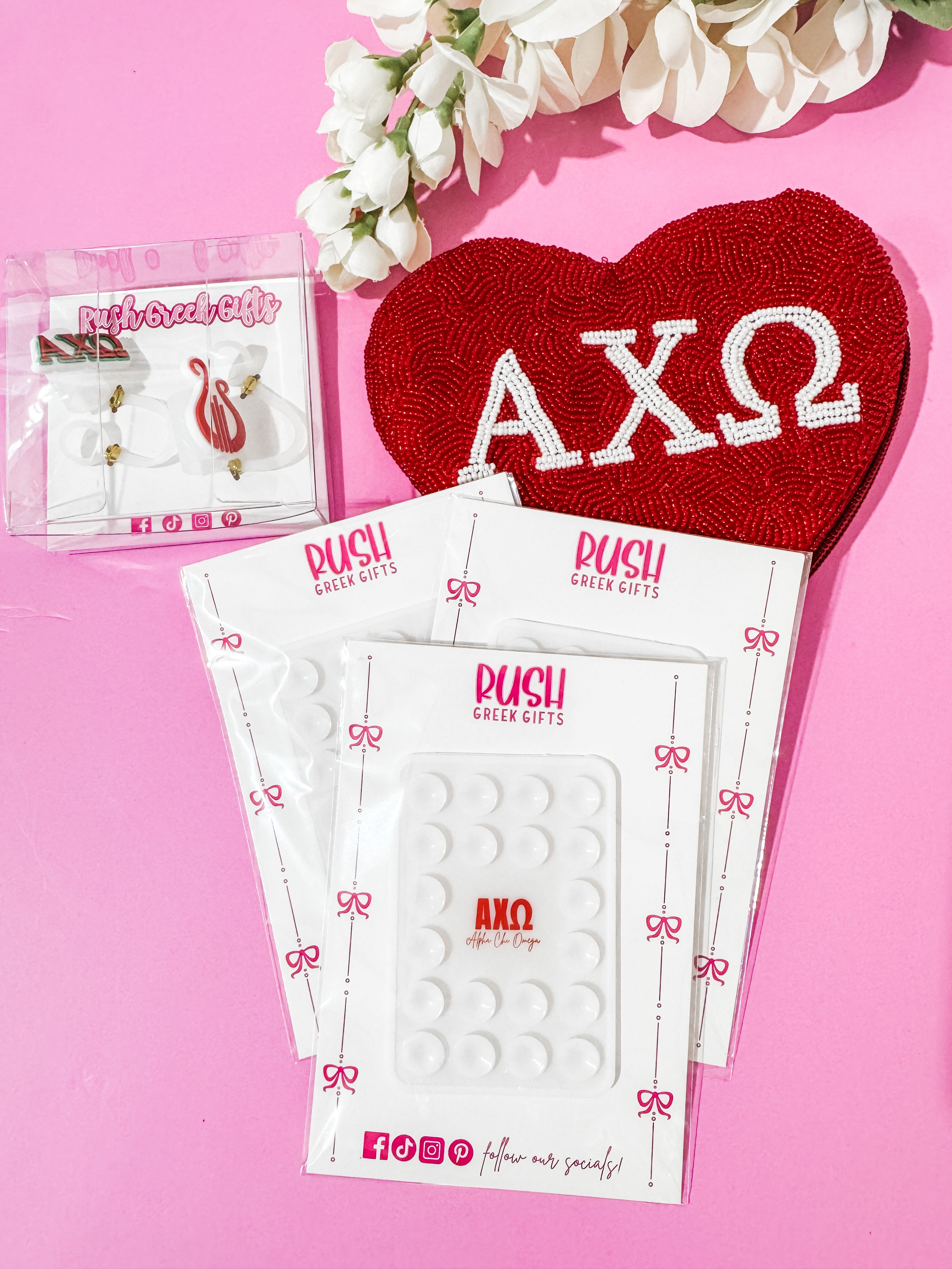 Attach our suction Alpha Chi Omega Phone WALL-IT to any surface for the perfect GRWM! Our WALL-IT has a peel-and-stick adhesive backing, and they feature sorority letters to add the cutest touch!