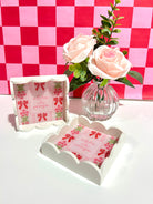 Our Scallop Trinket Tray is a stylish and functional solution for organizing your precious accessories! These trays keeps your jewelry neatly arranged and accessible, enhancing your vanity, dresser, or nightstand effortlessly. Darling scalloped rim detail featuring floral and festive designs. Store bracelets, earrings and more! Glossy finish. Dimensions: 4”L x 4”W x 1”H