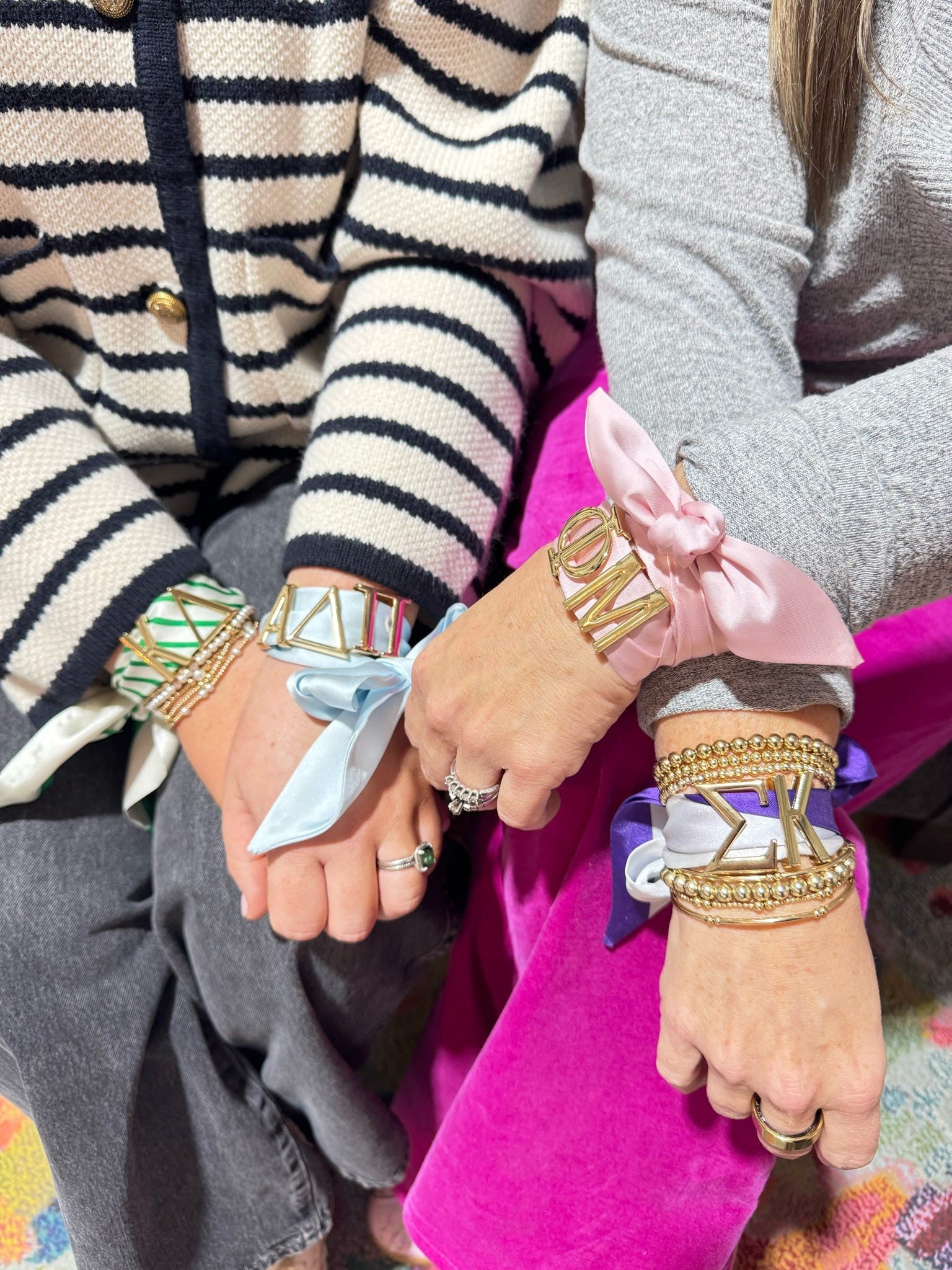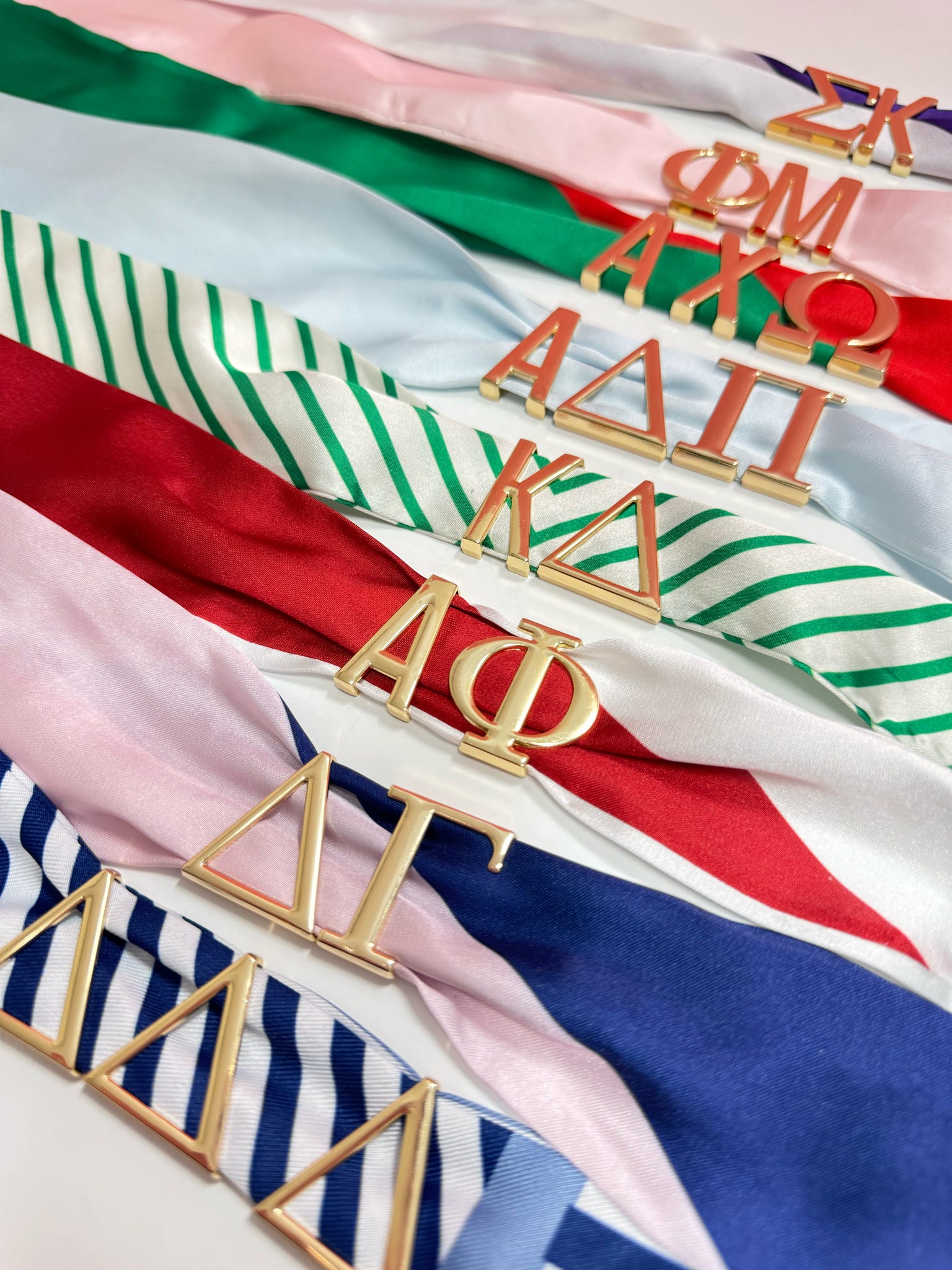 Add a chic touch of sisterhood style with our versatile Delta Zeta Sorority Charm Scarf featuring gold Greek letters. This darling accessory can be worn in a variety of ways and functions as the cutest necklace, bracelet, or purse strap wrap! Perfect Bid Day gift or Big/Little gift!